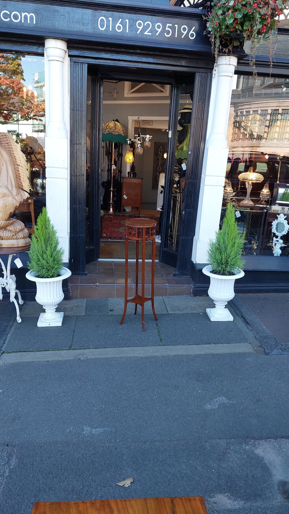 Edwardian Boxwood Strung Mahogany Jardinière Stand - with pierced frieze, on outswept legs - 11.5" diam x 39"h