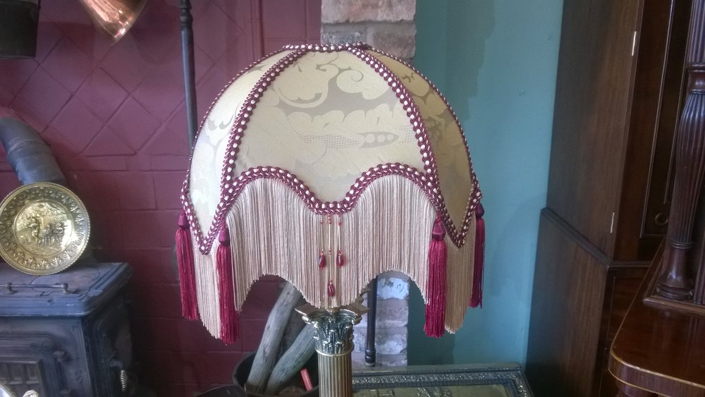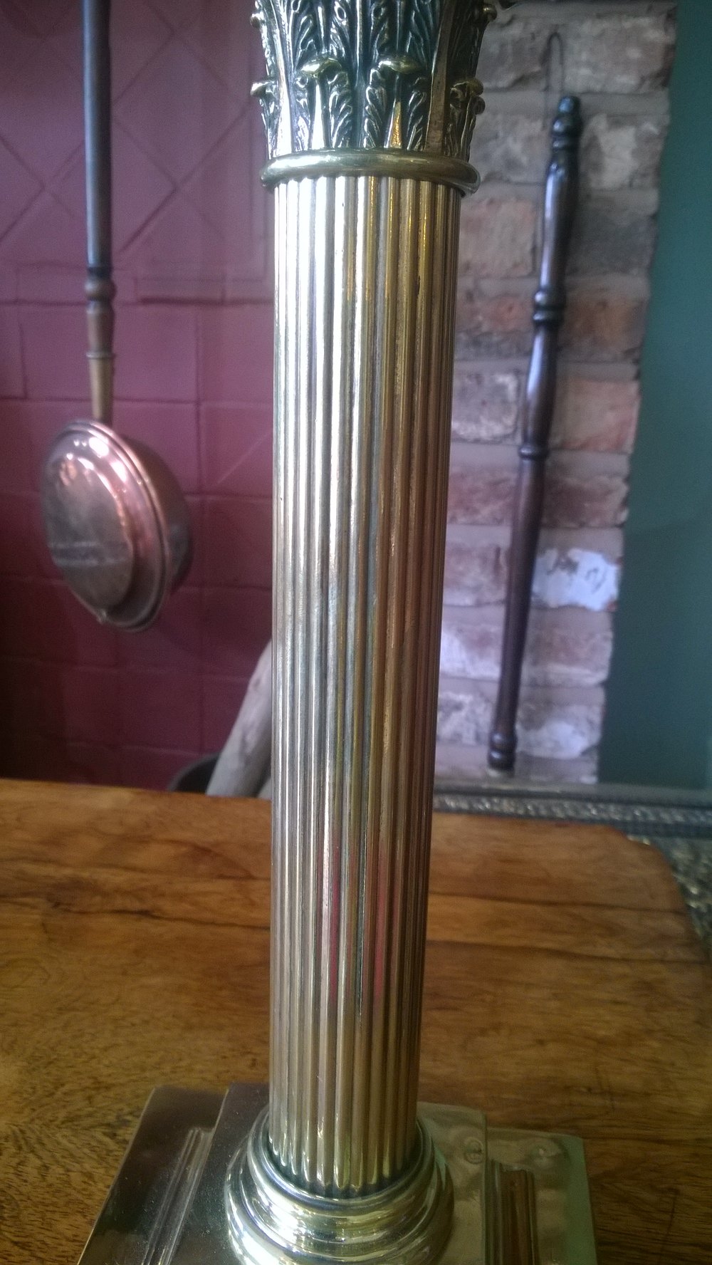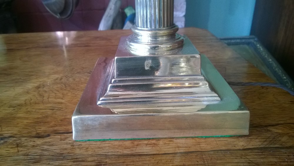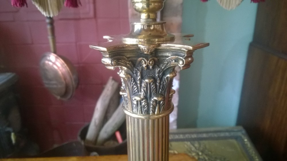 Edwardian Brass LargeTable Lamp in the form of Corinthian Columns on Platform Bases 14"diam x 28"h - The lampshade(s) are newly handmade silks by the same maker as provides the shades for Downton Abbey - all lights and lamps have been rewired with authentic corded flex, fitted with either foot switch or finger clicker switcth and are Pat tested.