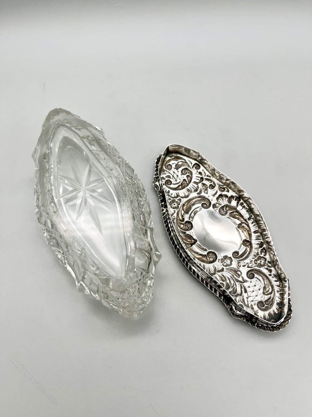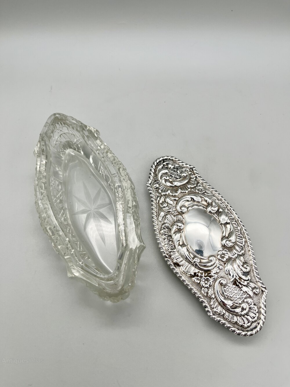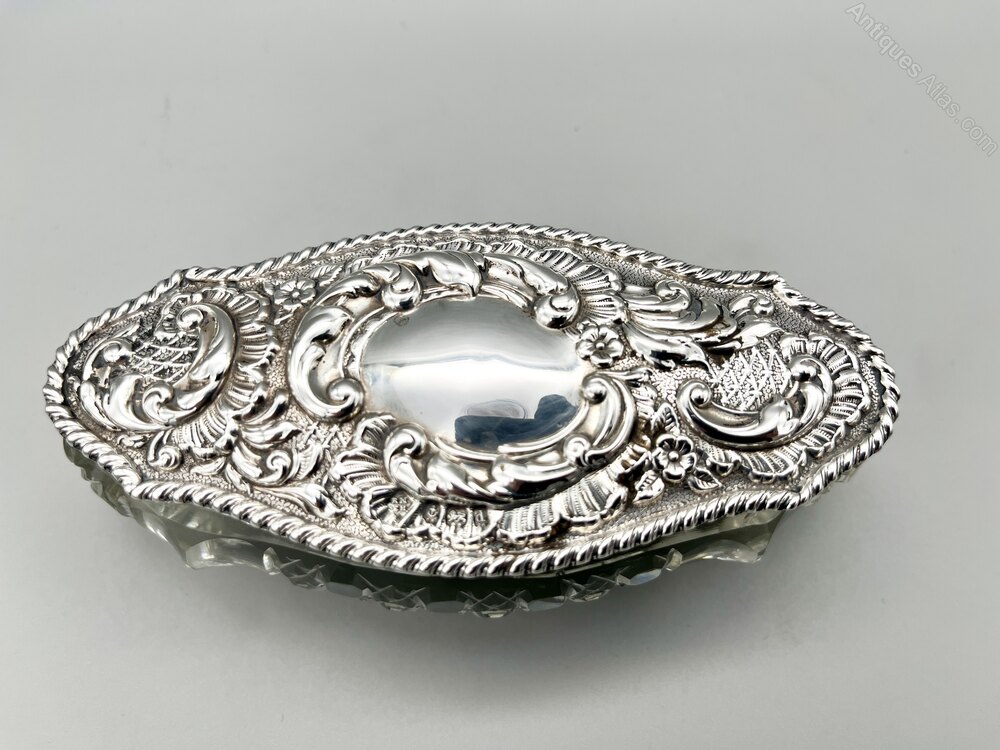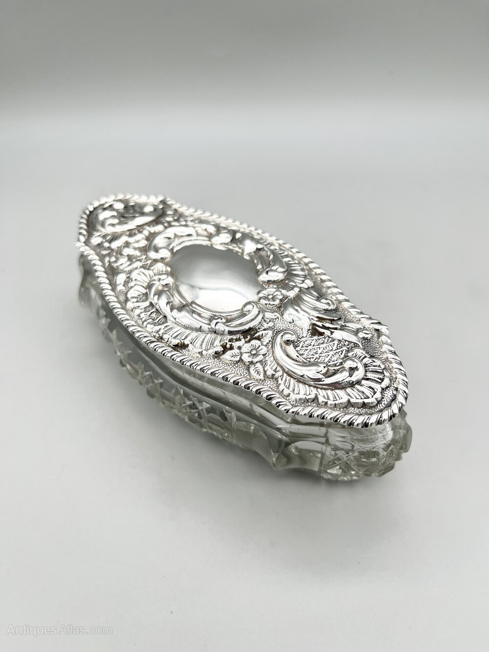 This is an attractive, large Edwardian Cut Glass and Sterling Silver Dressing Table Box. The box is bombe shaped with a hobnail cut body and a star cut base. The silver lid has a gadrooned rim and is embossed with scrolls, flowers and foliage around a blank central cartouche.