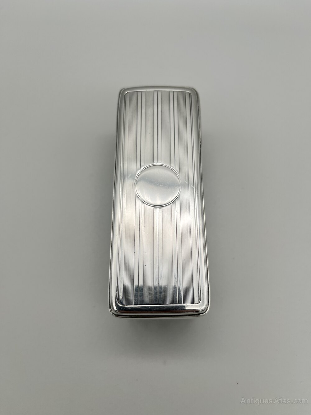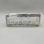 The pot is 9.9cm / 3.9ins long by 3.7cm / 1.4ins wide and stands 3.4cm / 1.3ins high. The lid by itself weighs in at a respectable 37.2g / 1.3oz of solid Sterling Silver and all together the pot weighs 184.9g / 6.5oz.