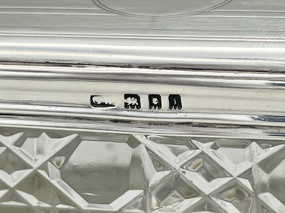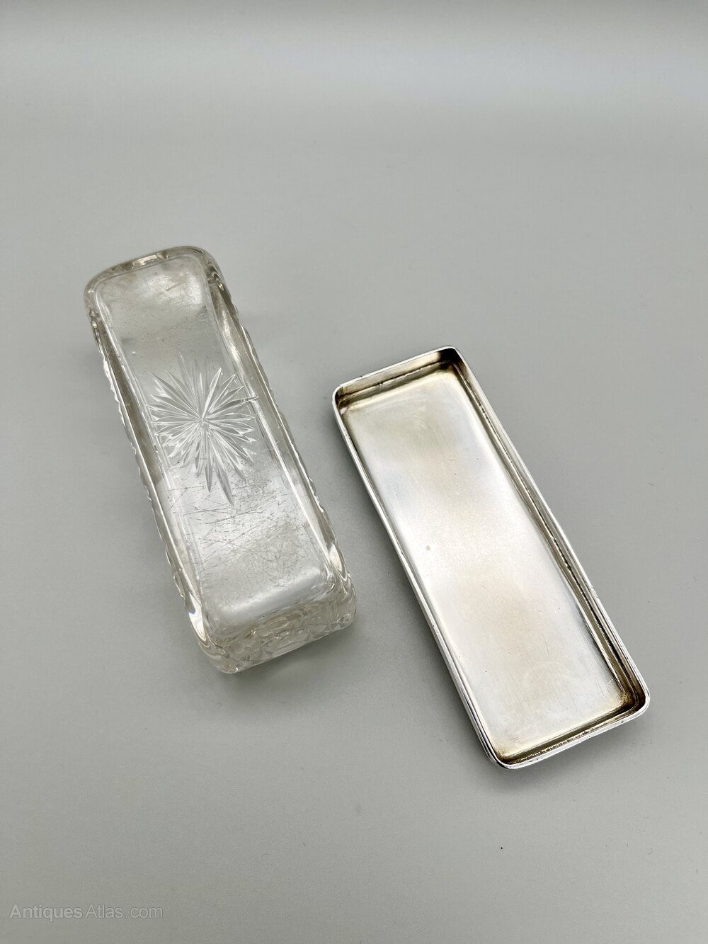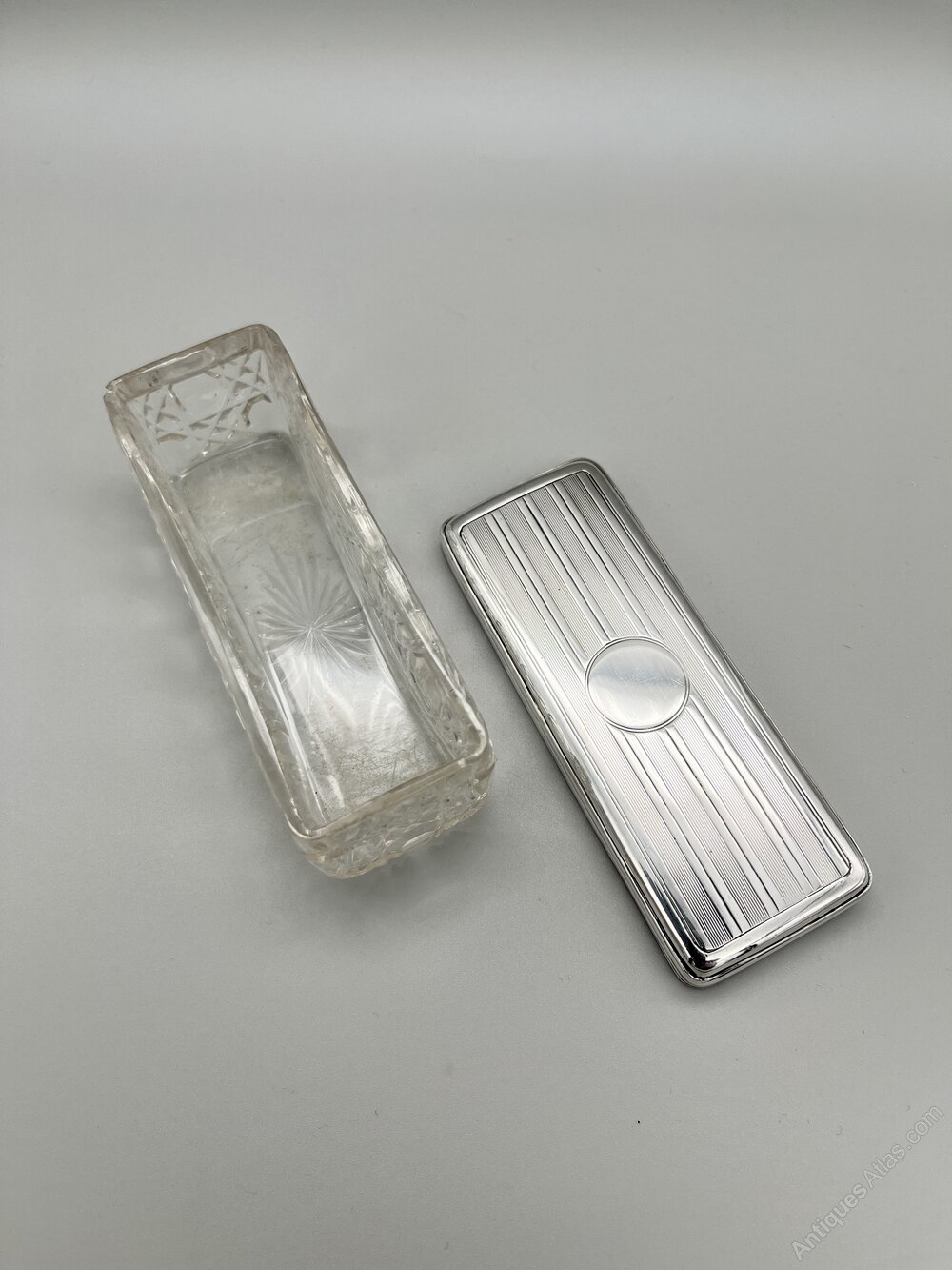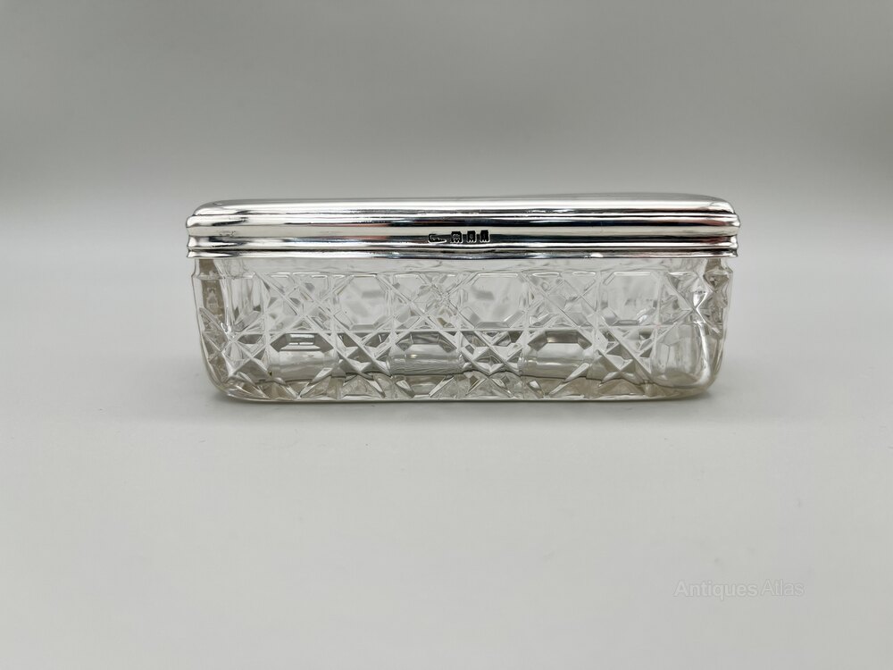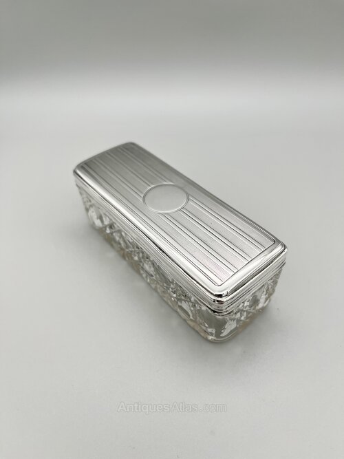 This is an elegant Edwardian Cut Glass Dressing Table Pot with a Sterling Silver Lid. The pot is oblong with rounded corners. The glass is hobnail cut all around the body and has a star cut base. The silver lid has engine turned stripes with a central circular blank cartouche.