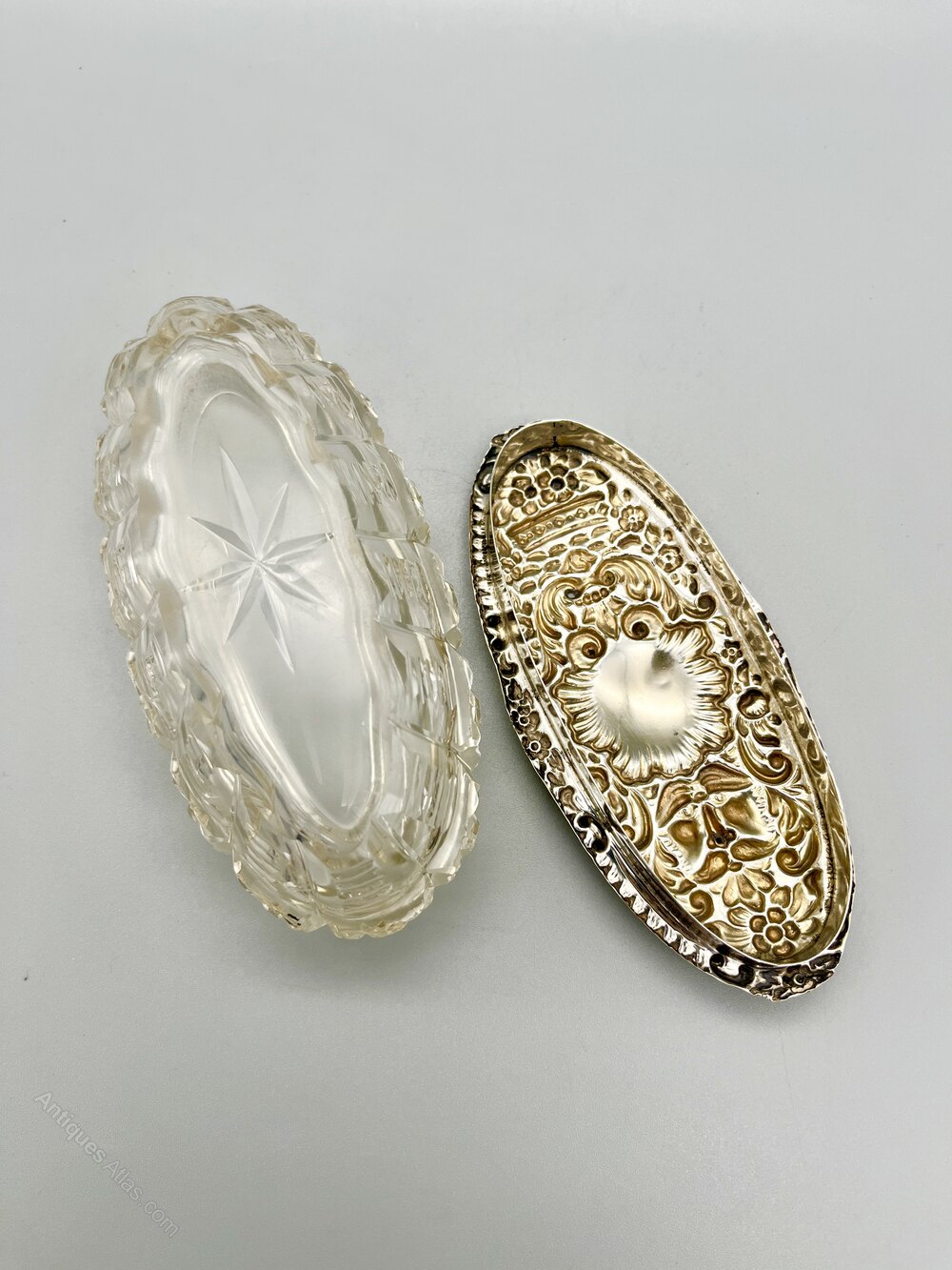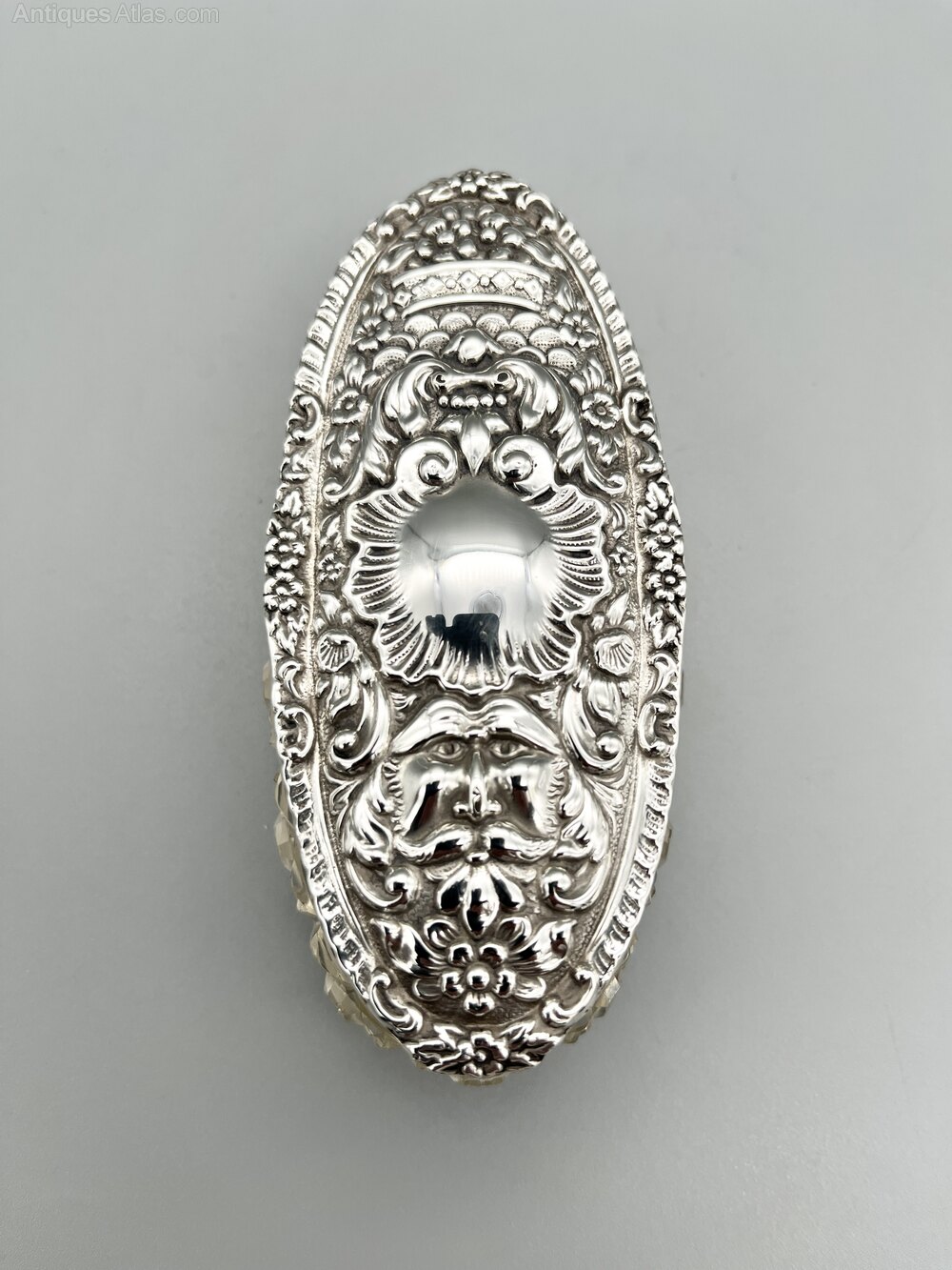 This is a fine quality Edwardian Cut Glass Dressing Table Pot with a Sterling Silver Lid. The glass pot is oval with a star cut base and the body is decorated with bands of ribs and star cut roundels. The silver lid has an embossed design in the folkore style, with the Green Man surrounded by flowers and foliage beneath a blank scallop shell cartouche. It is gilded on the inside.