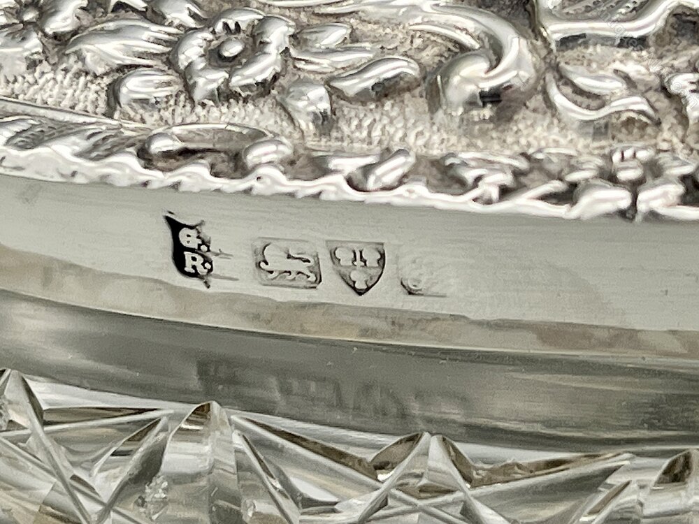 The hallmarks, on the outside rim of the lid, are a little rubbed but can still be read. They show the lion passant for Sterling Silver, the sword and three wheatsheaves assay mark for Chester, the cursive date letter F for 1906 and the G.N over R.H makers' mark for George Nathan and Ridley Hayes of Nathan & Hayes.