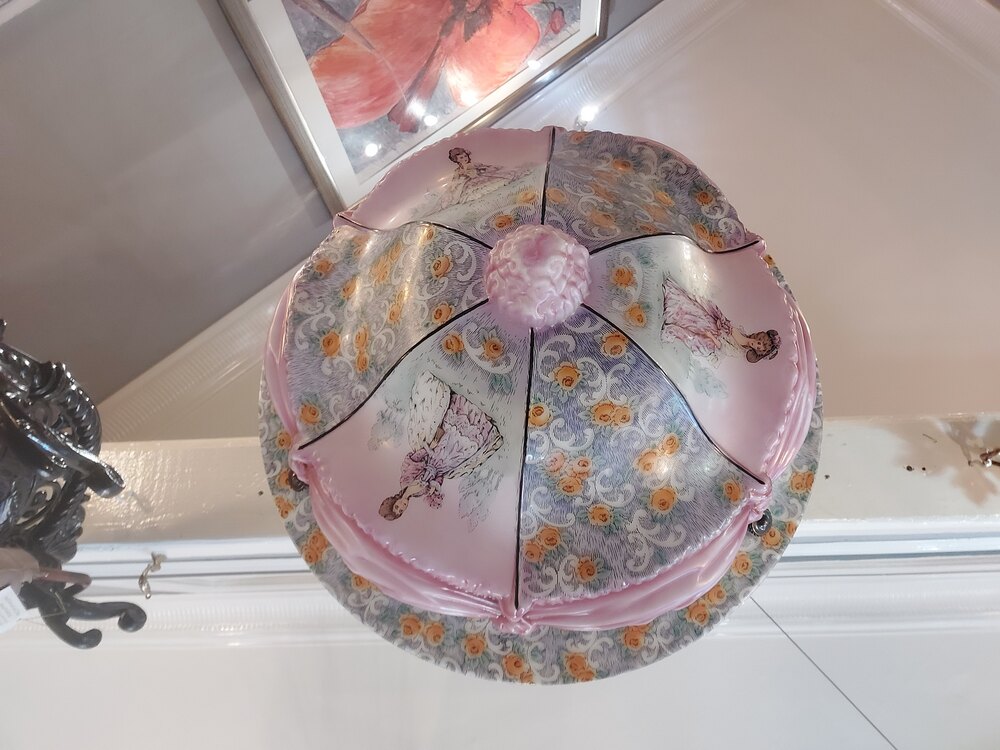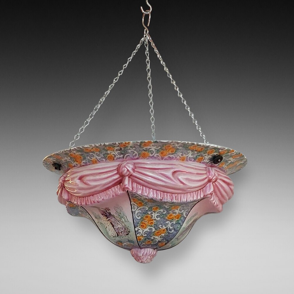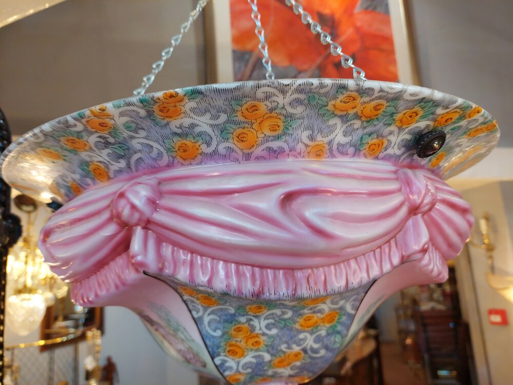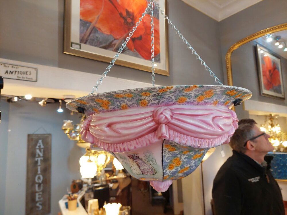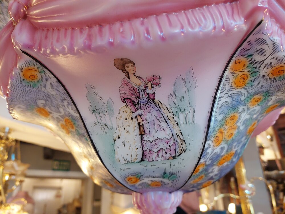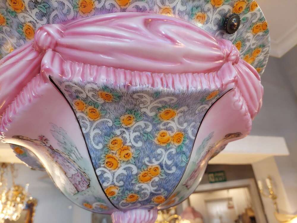 Edwardian Glass Ceiling Lightshade, decorated with curtain swags, and ladies in traditional dress - 20" diam x 10"h (plus chain) - all lights and lamps have been rewired with authentic corded flex, fitted with either foot switch or finger clicker switch and are Pat tested