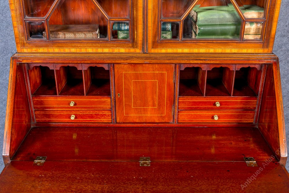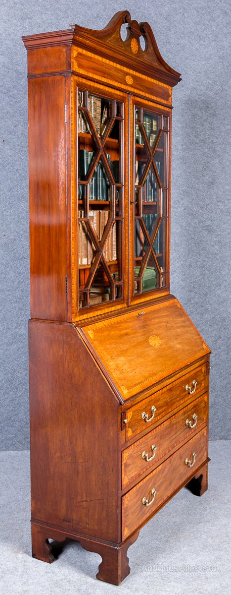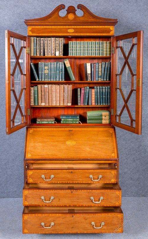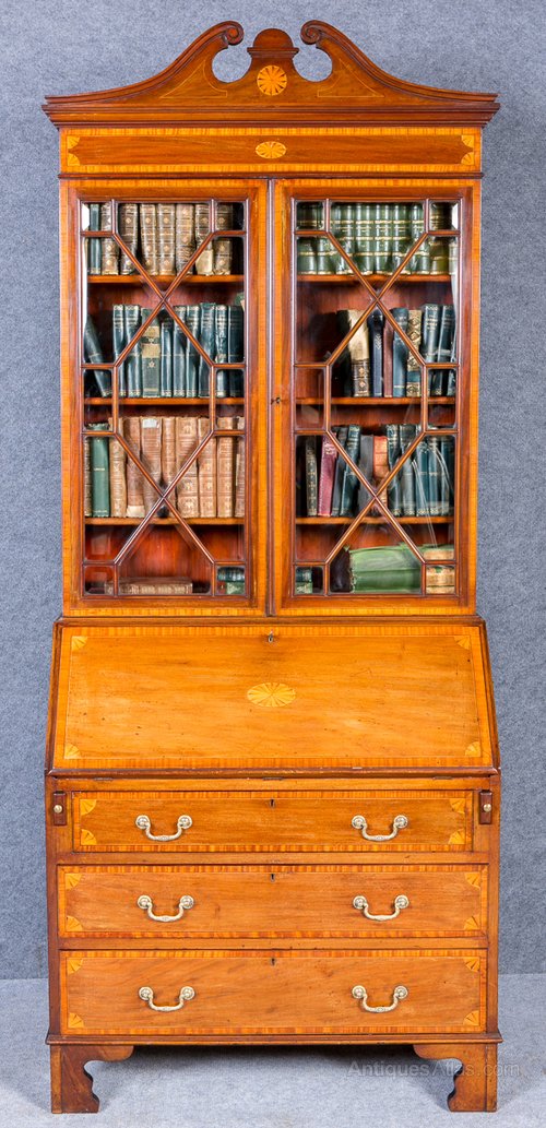 An Edwardian Sheraton revival mahogany bureau bookcase. The moulded cornice with a patrae inlaid swan neck pediment above a satinwood banded and shell inlaid frieze. The 2 satinwood banded doors having 13 pane astragals with bevel edged plate glass and open to 3 adjustable shelves. The conforming inlaid bureau fall opens to reveal an interior with 6 pigeon holes, 4 drawers and central cupboard. The base having 3 satinwood banded and inlaid drawers with mahogany linings and brass swan neck handles and the standing on shaped bracket feet. With working locks and keys. Condition good with slight bruise to the fall. Sizes:- Height...87.75''/ 223cm. Width...36.25''/ 92cm. Depth of Base...16.5''/42cm. Depth of Top...9.25''/ 23.5cm. Delivery to most of U.K. mainland £55.