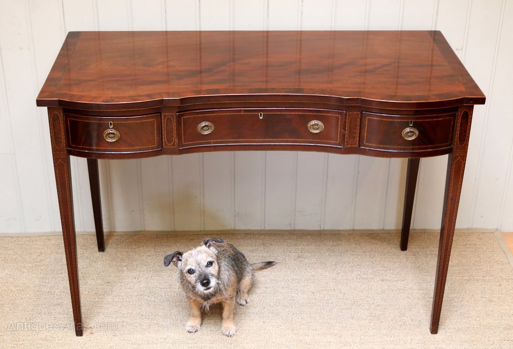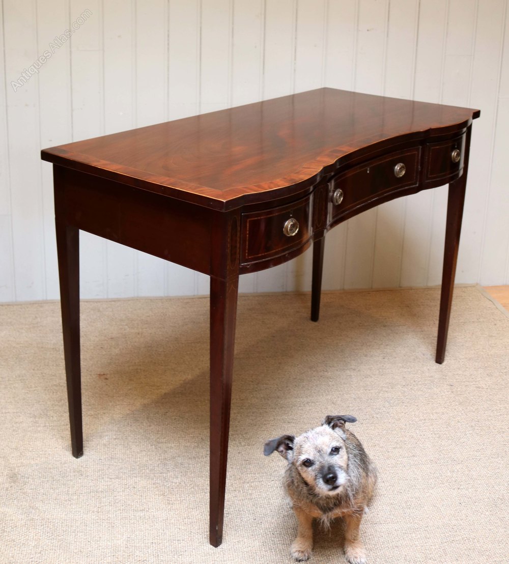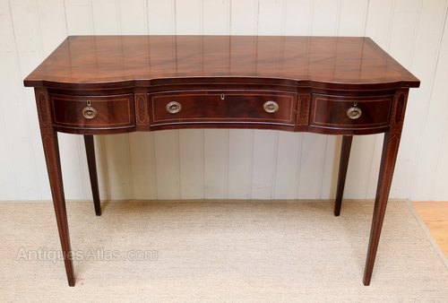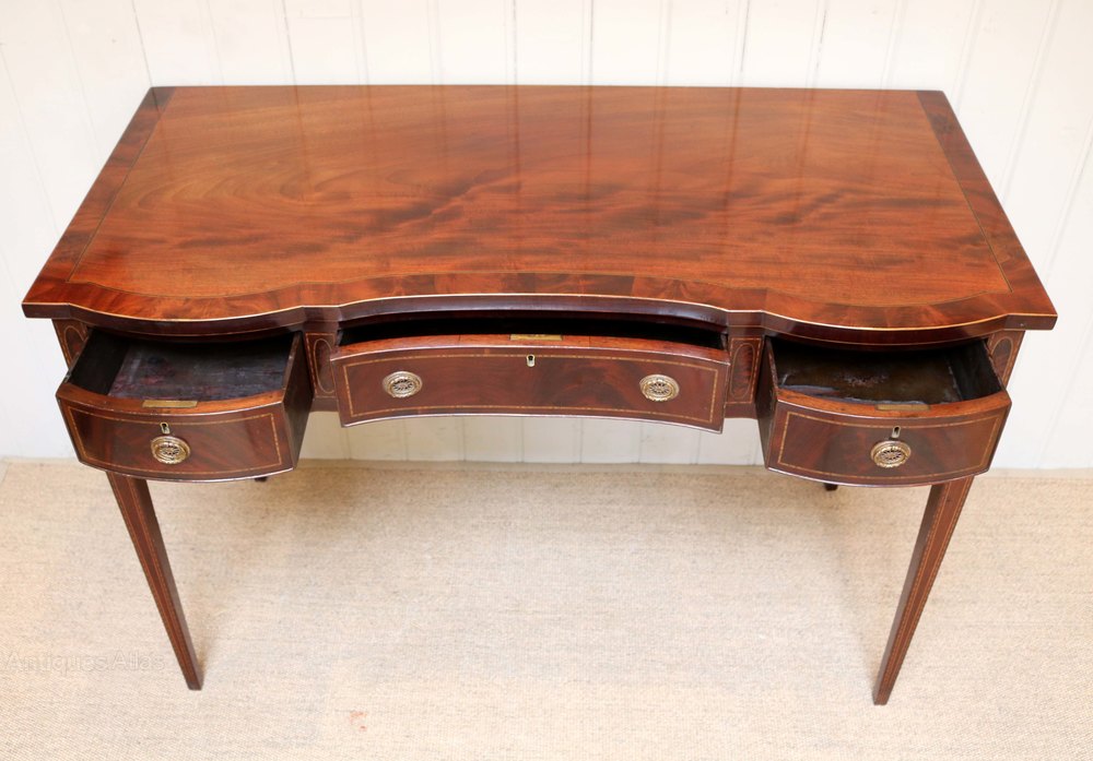 Edwardian inlaid mahogany side table having a serpentine front, boxwood stringing with three drawers having original handles raised on straight tapering legs