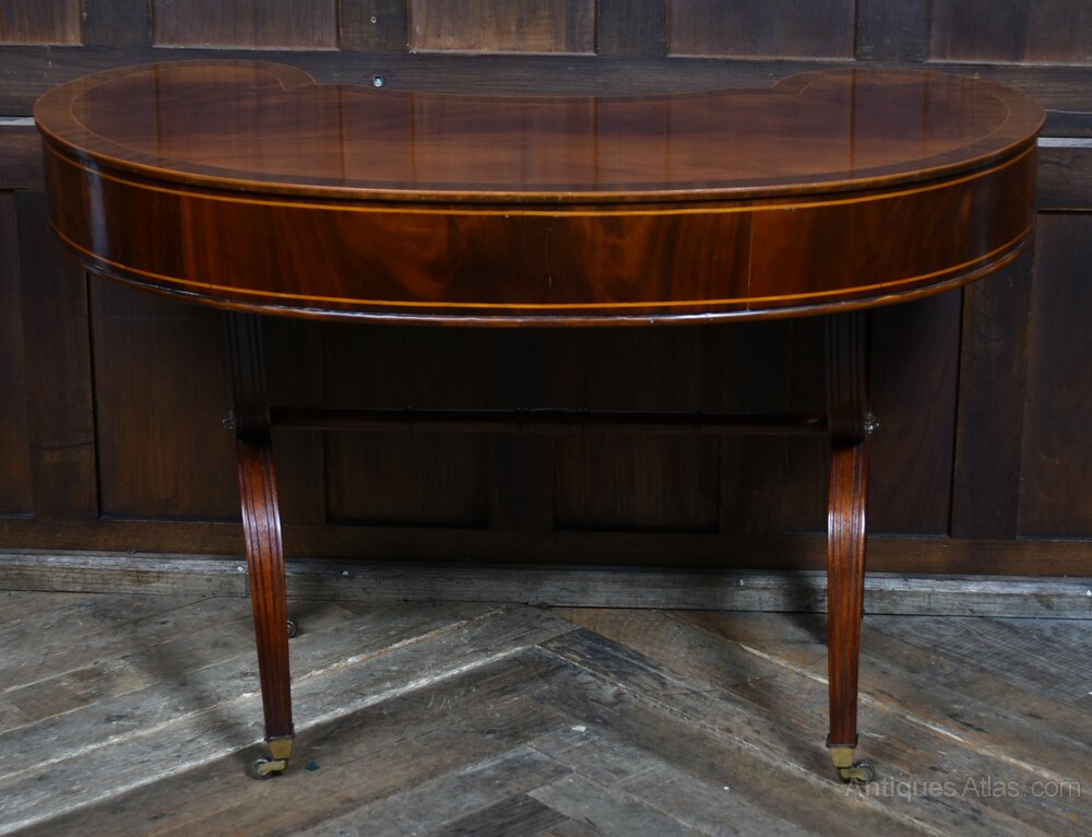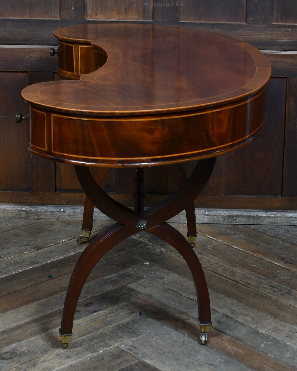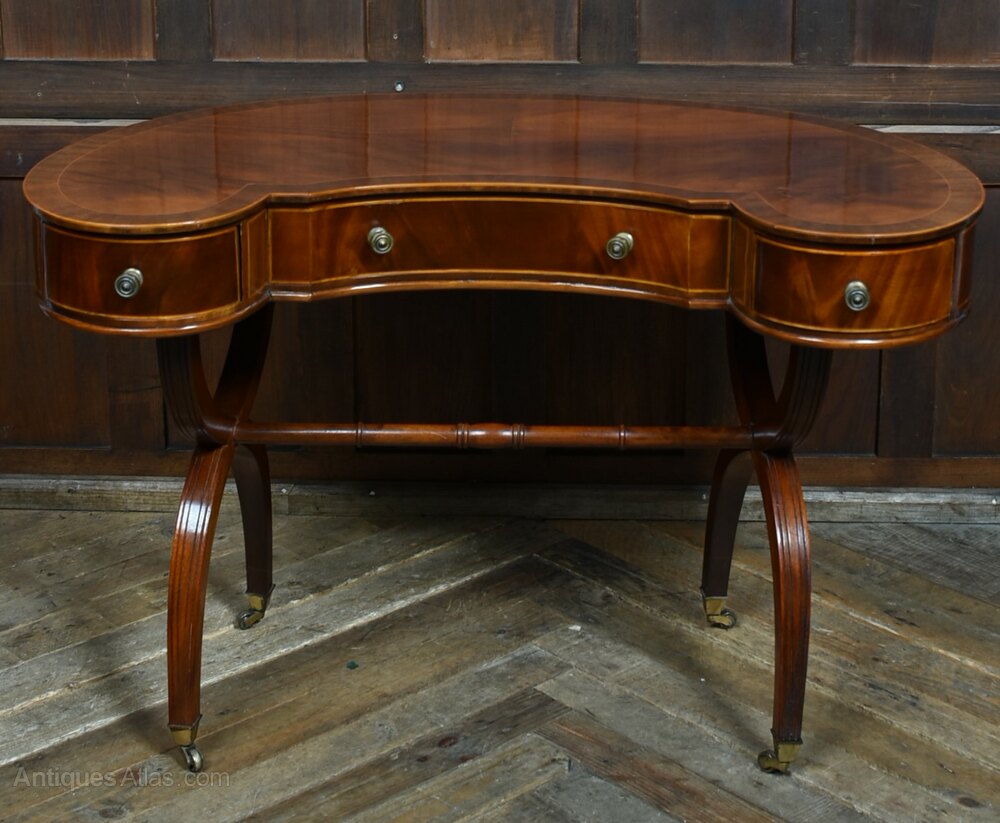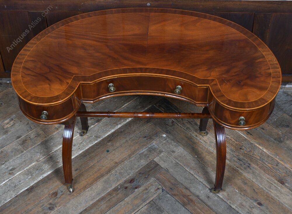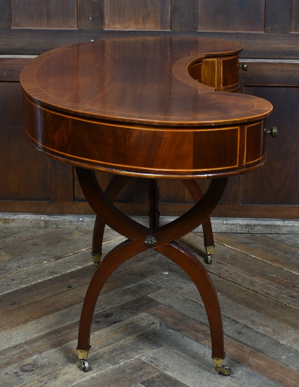 An elegant Edwardian kidney‑shaped desk, finely crafted in warm, well‑figured mahogany and enriched with delicate satinwood inlay that traces the outline of the top and drawers. The desk offers three drawers with original brass knobs, each running smoothly and providing practical storage. It stands on elegant, slender legs with fluted detailing, united by a beautifully turned stretcher. Brass castors complete the design, allowing the desk to be moved with ease. A charming and versatile piece, ideal as a writing desk, dressing table, or as an attractive decorative feature with all the grace and understated elegance characteristic of the Edwardian period. The height of the knee hole is 56.5cm