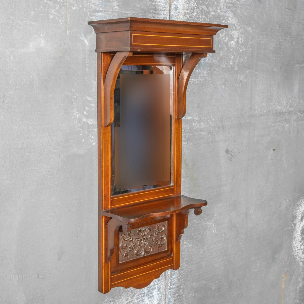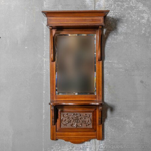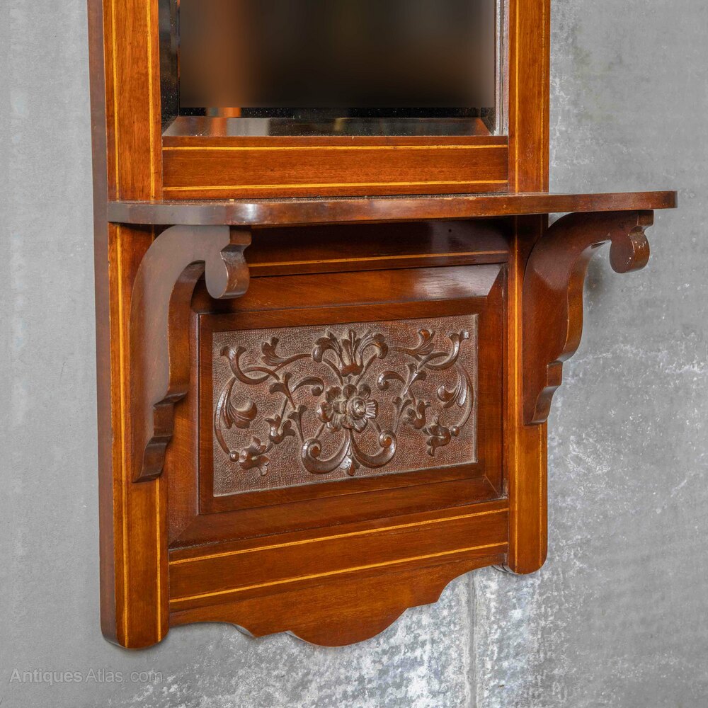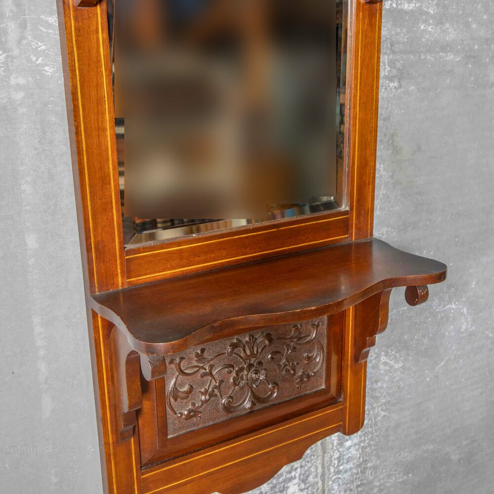 A much above average hall or vestibule mirror in mahogany with boxwood stringing and a crisply carved panel under the shelf. The bevelled mirror has slight fading down the left hand side but barely noticeable in certain lights. Called a last look mirror in parts of Lancashire and usually placed as near to the front door as possible, giving you a last look before you exited. In overall super condition and ready for work.
