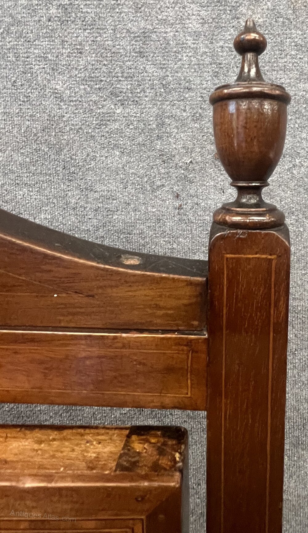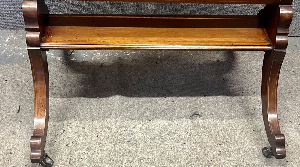 An Edwardian mahogany and inlaid cheval mirror. The arched pediment with boxwood line inlay and flanked by turned finials. The tilting mirror plate with bevel edge and set within the inlaid satinwood banded mahogany frame, the supports having conforming boxwood stringing. The whole raised on out swept legs terminating in casters with inlaid shelf. Condition- Good with no breaks or repairs and a very slight foxing but ready for use in the home or boutique. Dimensions:- Max.Height…72.5’’/ 184cm. Width…26.25’’/ 66.5cm. Depth at Base…22.75’’/ 58cm. Delivery to most of U.K. £55.