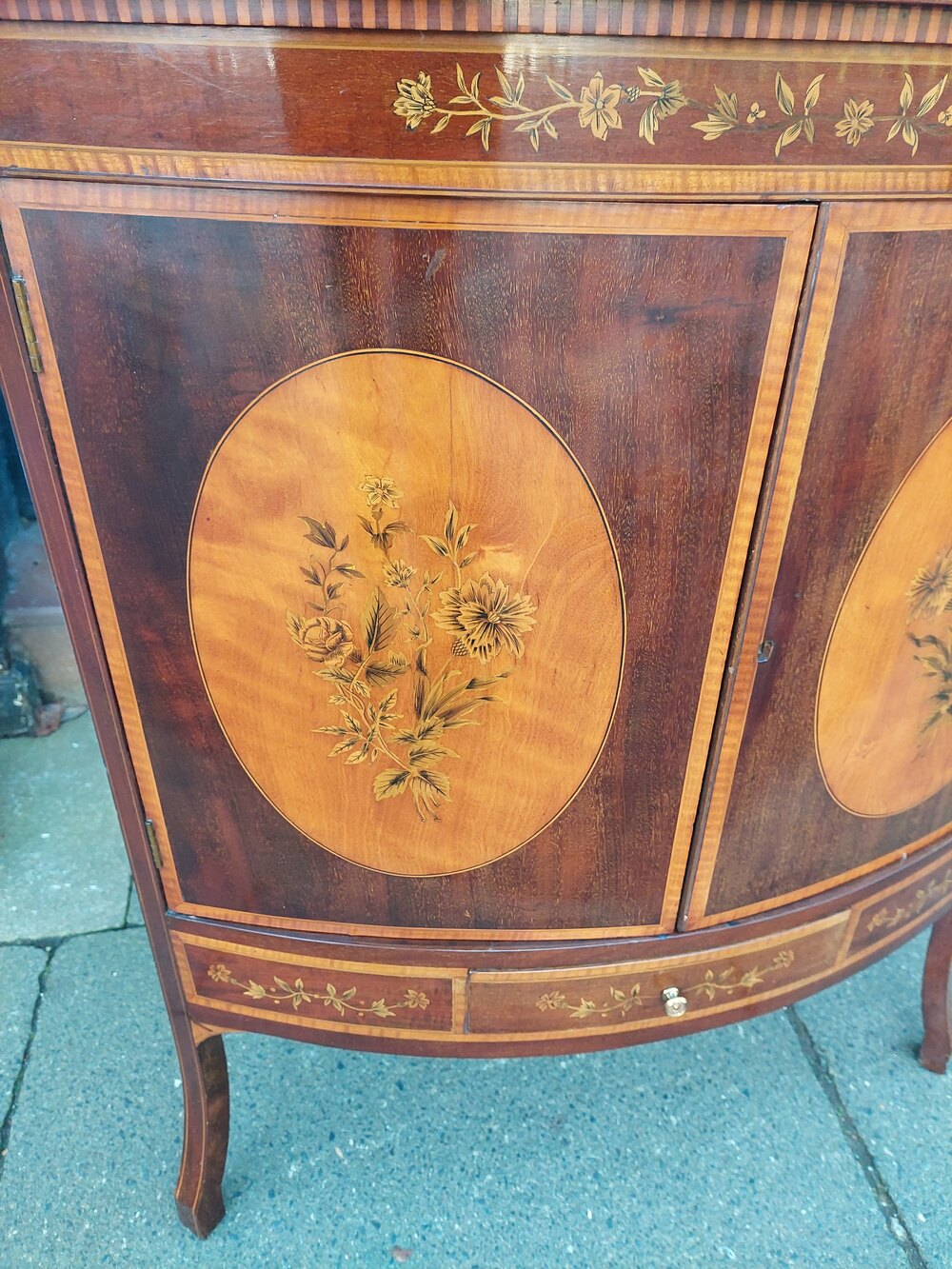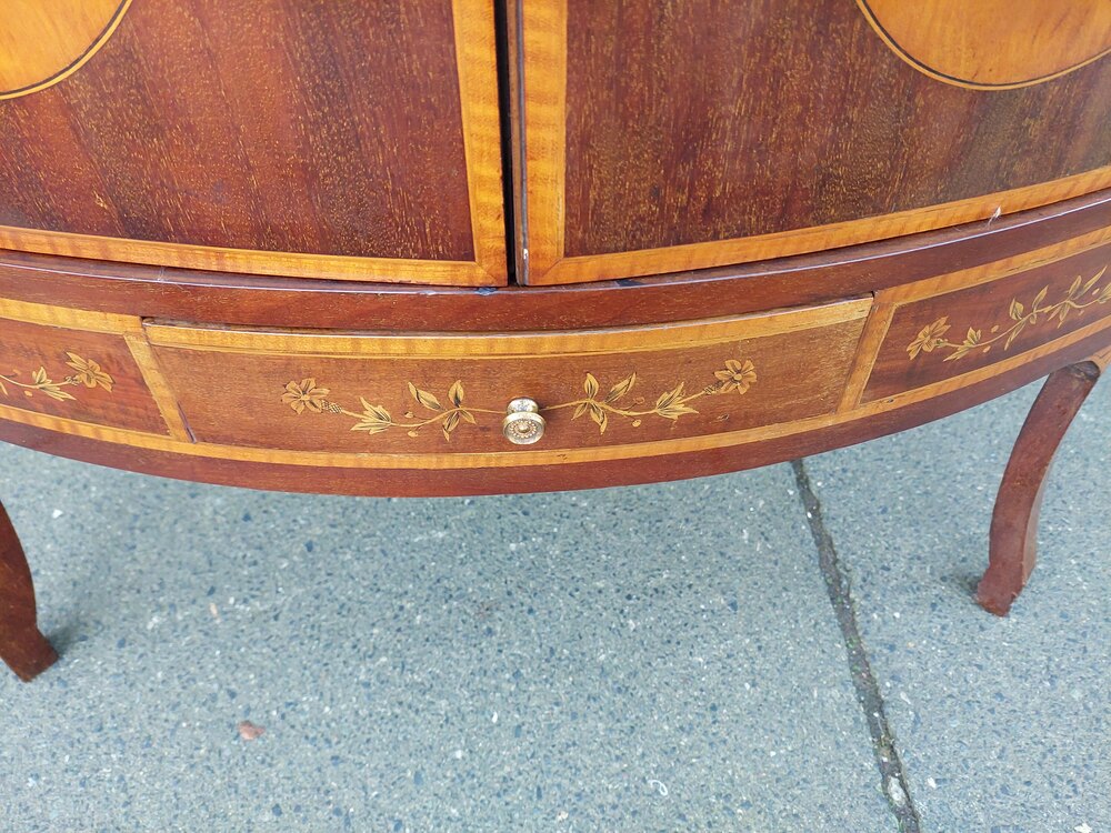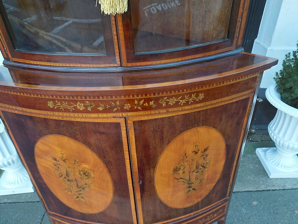 Edwardian Sheraton Style Mahogany and Inlaid Floor Standing Corner Display with cupboard under the display case on slender splayed legs - 20"d x 20"d x 75"h