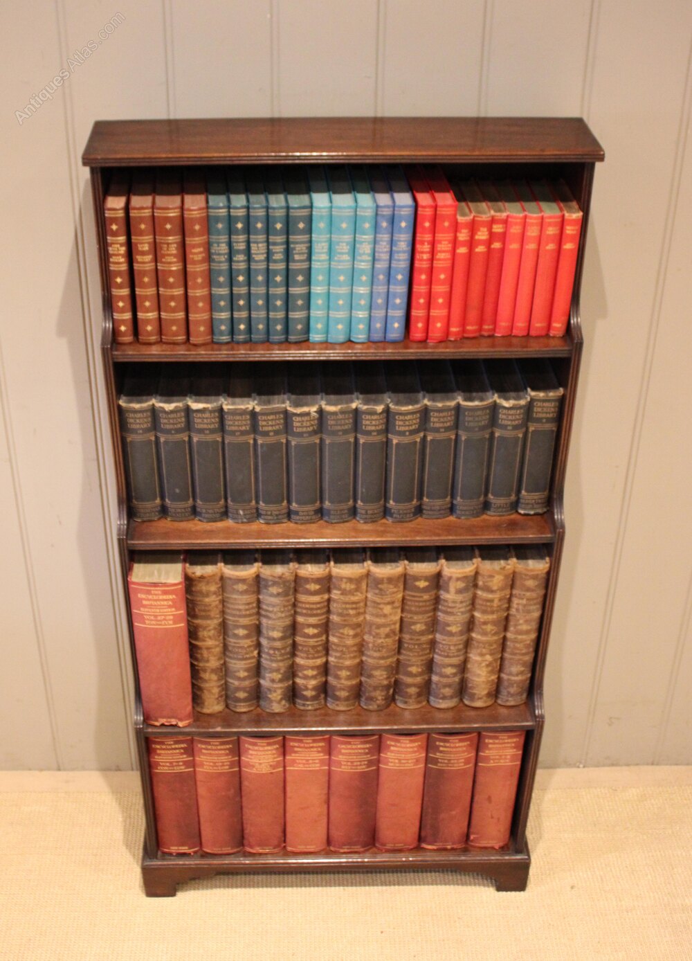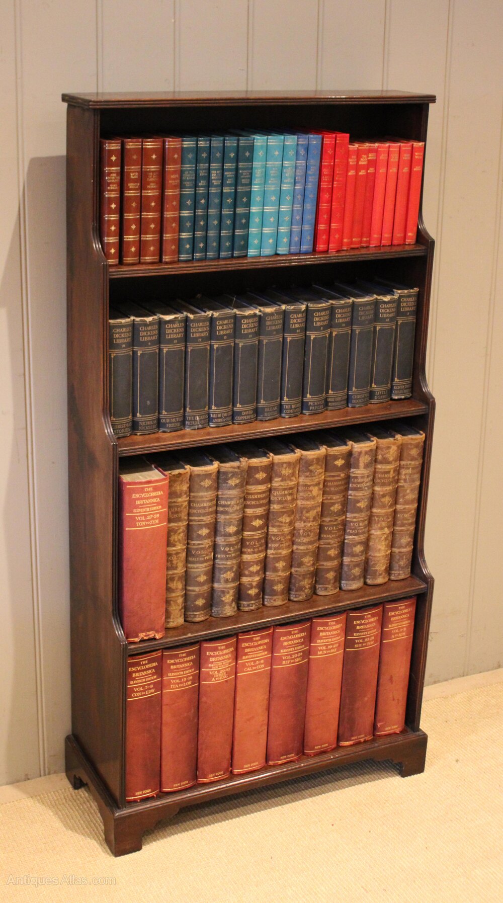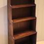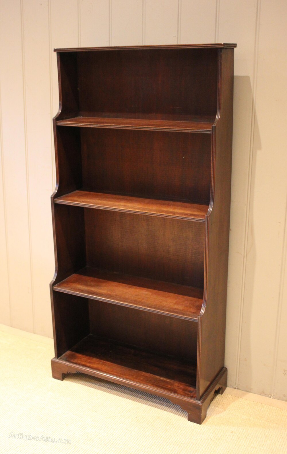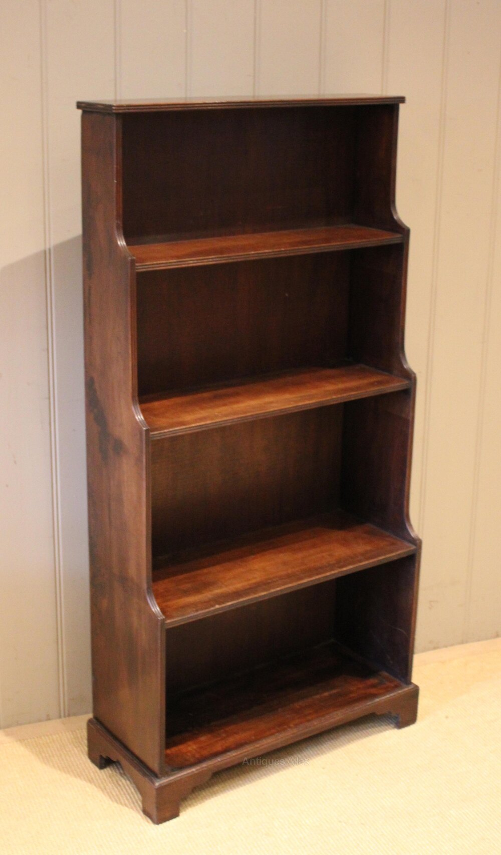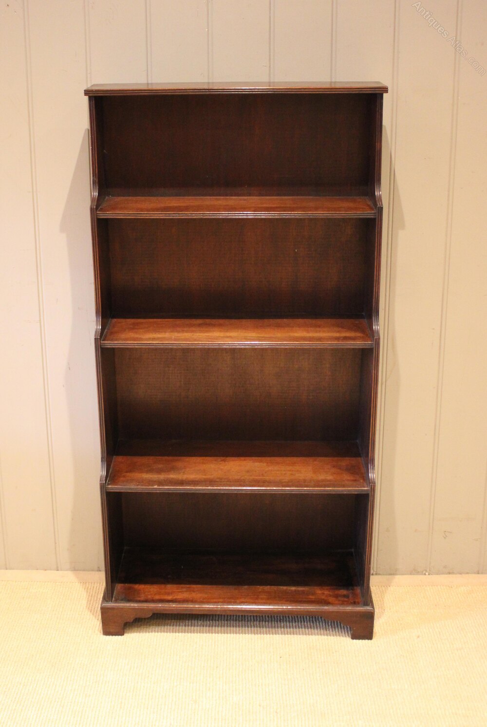 Edwardian mahogany graduated open bookcase having four fixed shelves with reeded edges , raised on bracket feet . The shelf dimensions are 58 cm wide and from the bottom up 23.5 cm deep by 29 cm high , 23.5 cm deep by 31.5 cm high , 18.5 cm deep by 26 cm high and at the top 14.5 cm deep by 24 cm high .