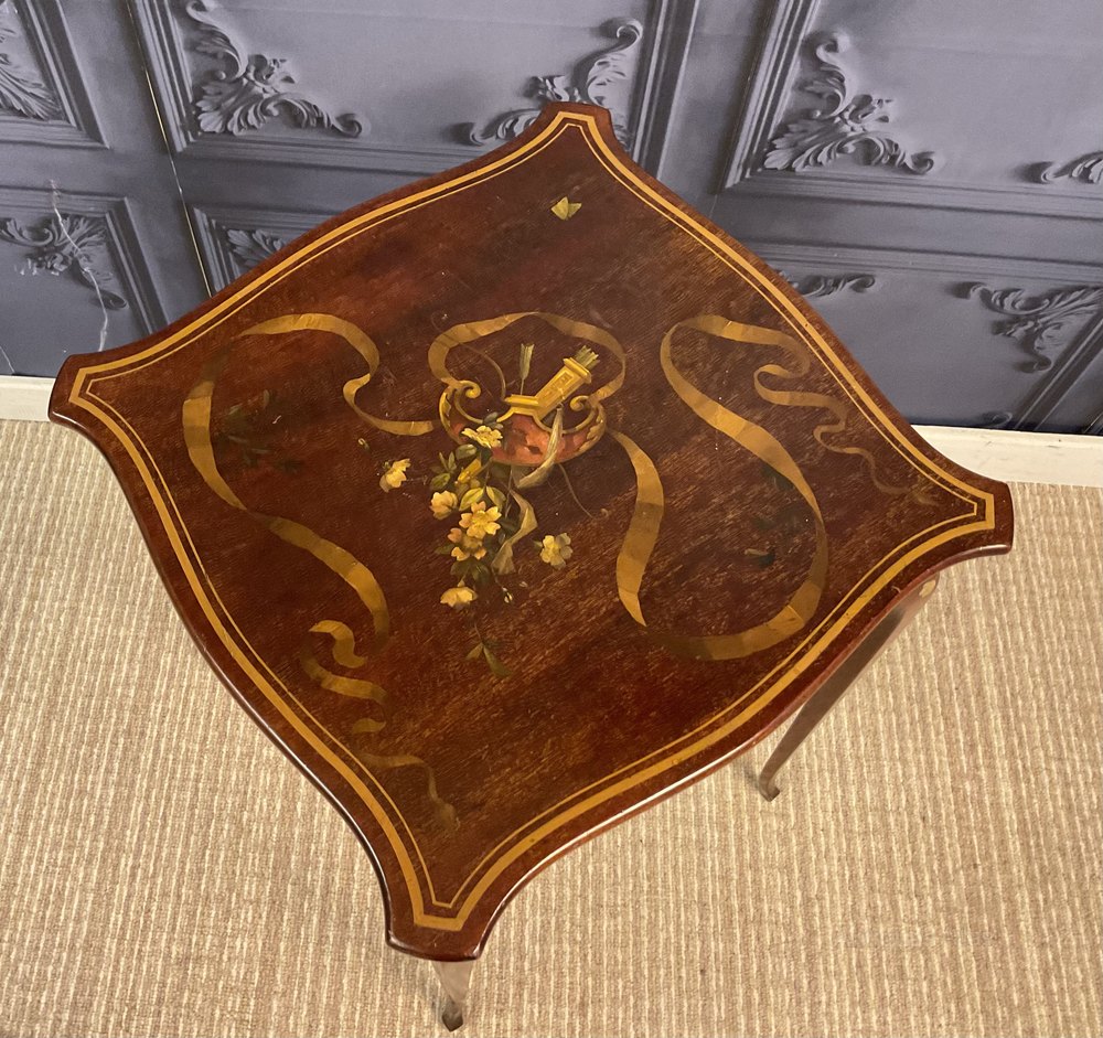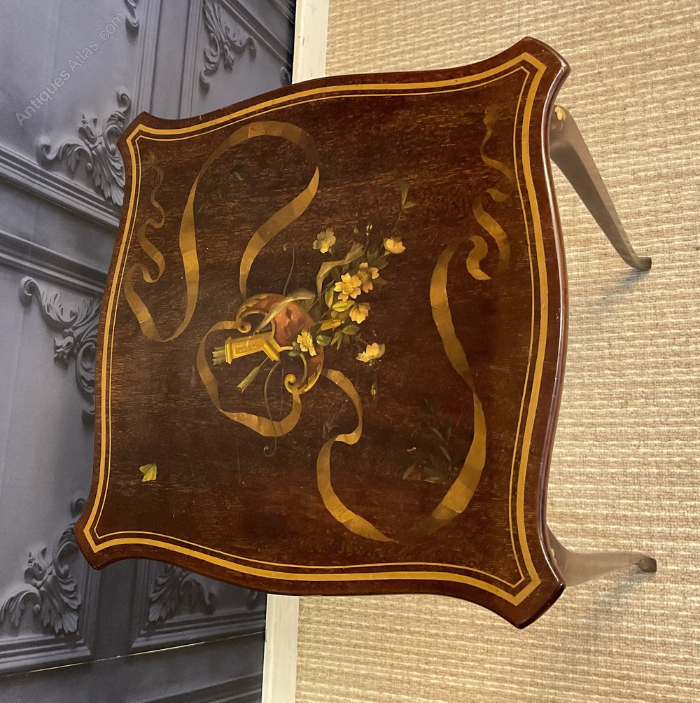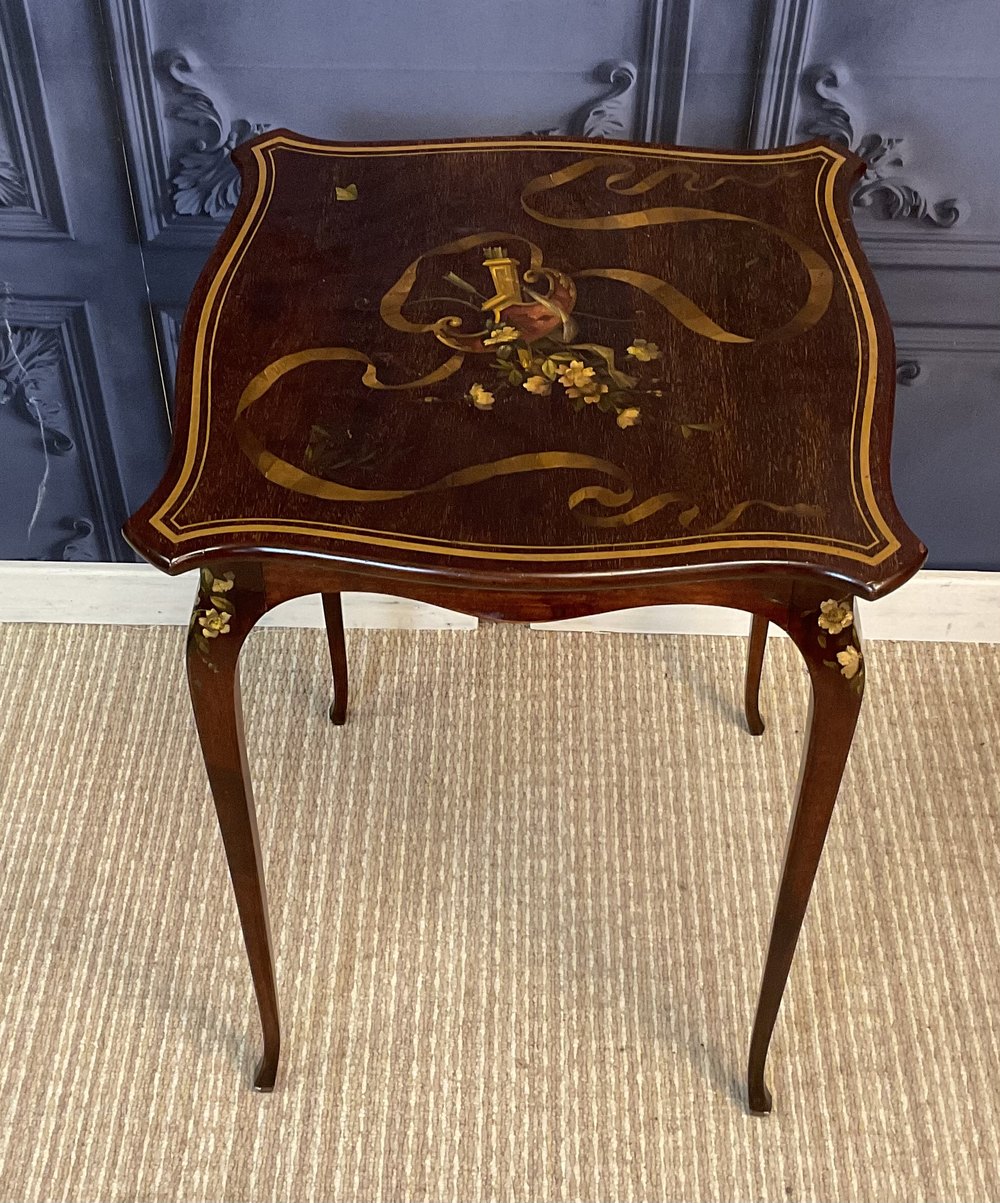 Good quality Edwardian Mahogany Occasional Table with original painted decoration to the table surface and top of the legs, having a shaped apron and supported on slender cabriole legs