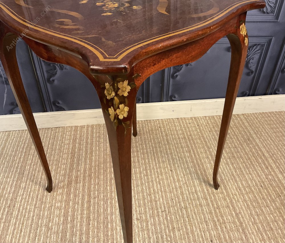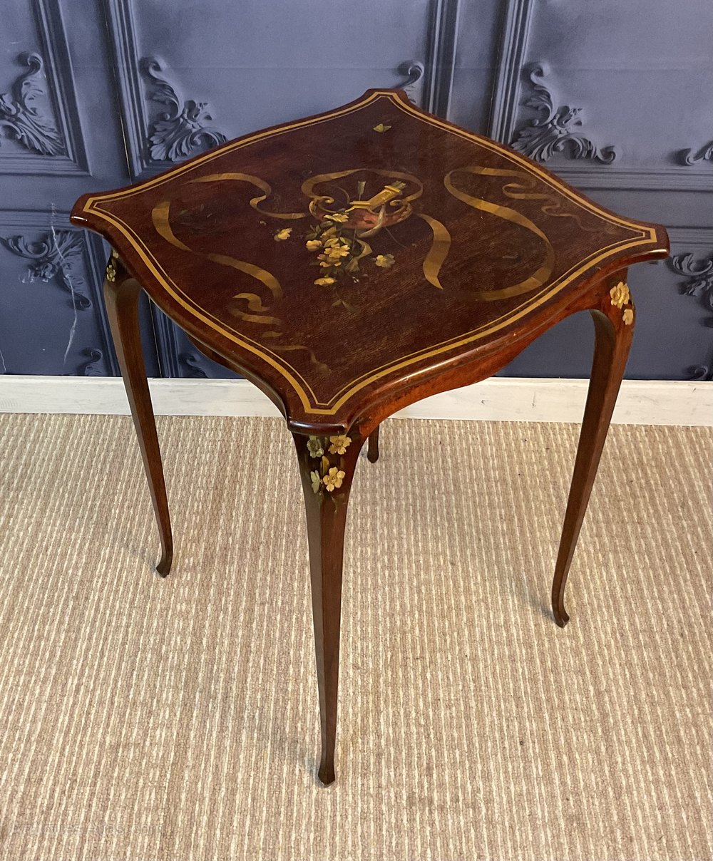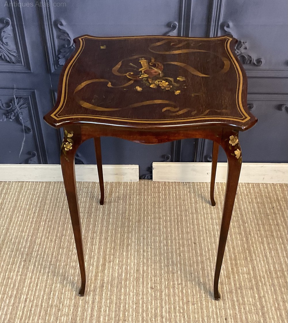 Good quality Edwardian Mahogany Occasional Table with original painted decoration to the table surface and top of the legs, having a shaped apron and supported on slender cabriole legs