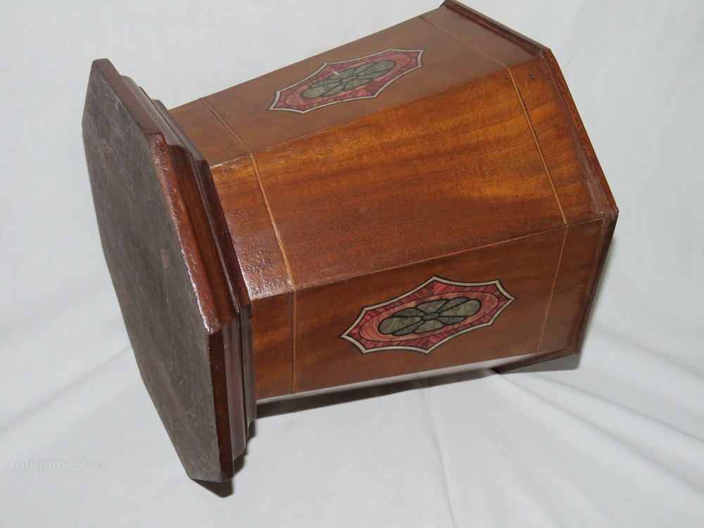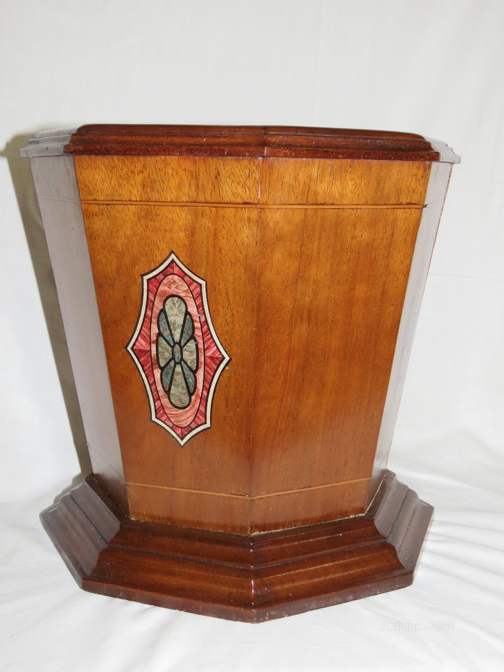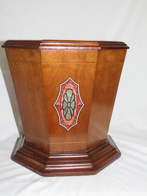 A stylish Mahogany Planter with boxwood stringing and transfer printed decoration. It has an octagonal body set upon a stepped base.