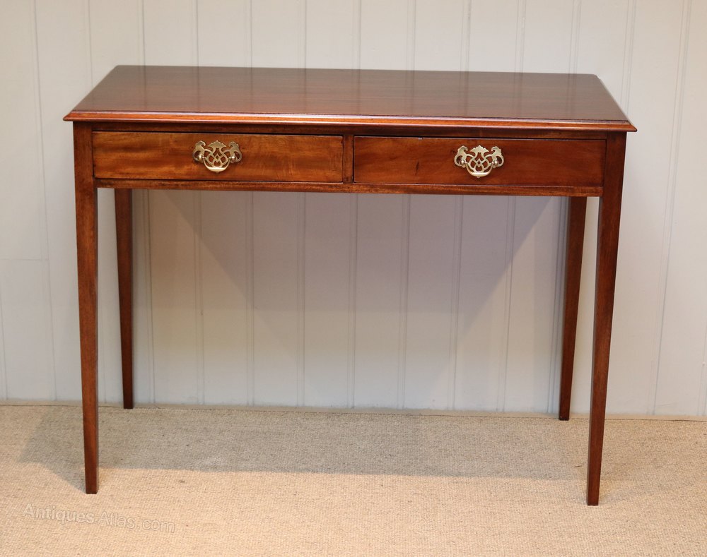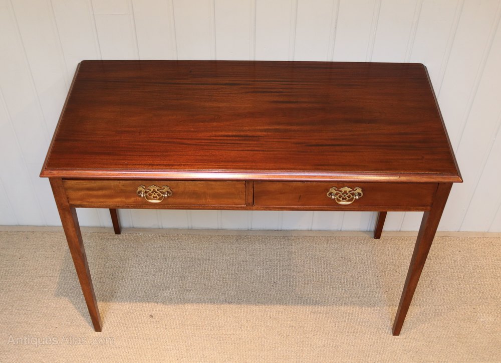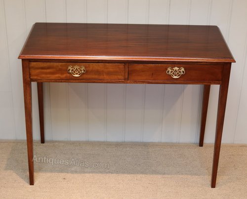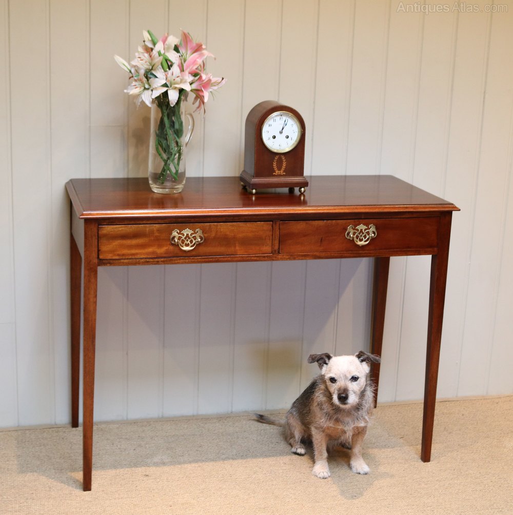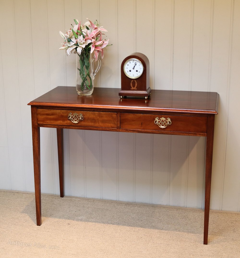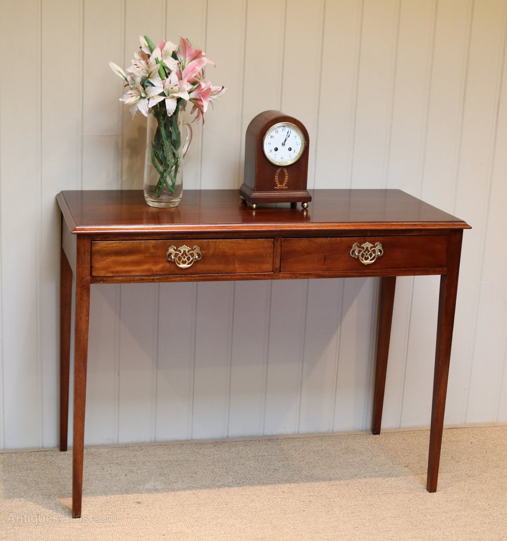 Edwardian mahogany side table having two drawers ( lined with old newspapers) with brass handles raised on straight tapering legs