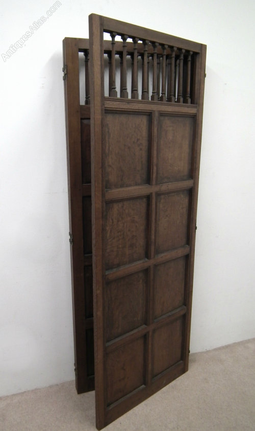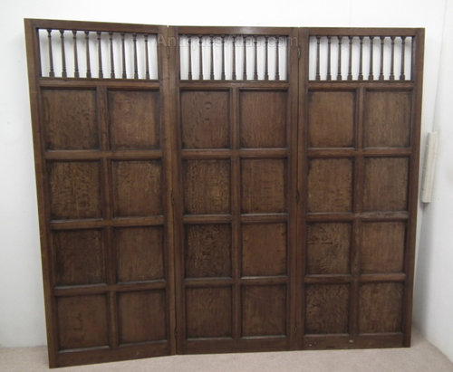 Edwardian oak panel three fold screen, each fold comprising eight panels with a spindle gallery top section, mounted with a silver plaque inscribed 'Panels from Castleton Hall / Given by George to Lydia / 1917'.