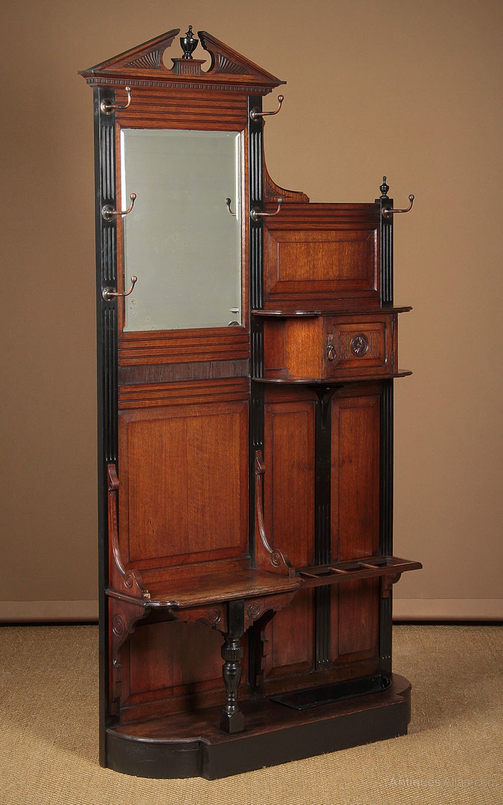 Unusual Edwardian oak hallstand c.1905. Six large hooks for hats and coats etc, a bevelled mirror, shelf and small cupboard. Over a stick or umbrella holder with removable drip tray and a small seat. Panelled oak back, ebonised uprights with fluted detail and a crisply carved pediment with turned urn finial. Carved brackets and a turned column leg to support the seat. Very good colour and condition, cleaned and waxed in our workshops.