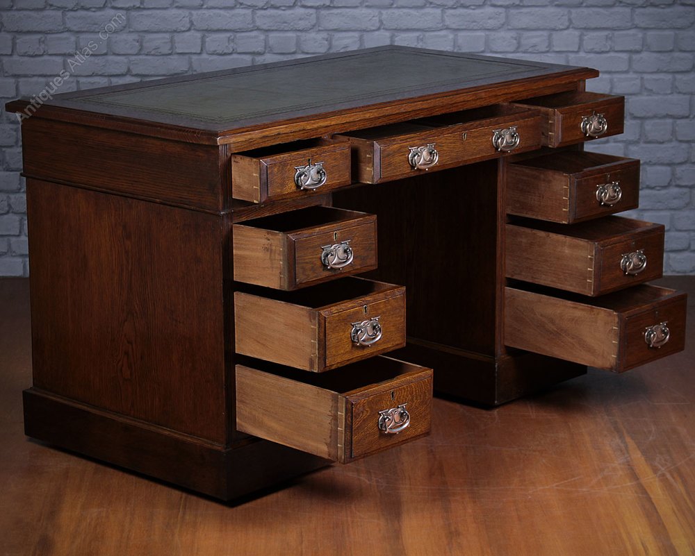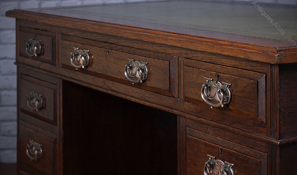 Fine example of the classic Edwardian oak pedestal desk c.1910. 48″ x 26″ top with leather writing surface and three drawers on twin pedestals with three drawers of graduated depth to each. Raised and fielded solid oak drawer fronts retaining their original copper plated handles. Solid oak sides and rear, polished on all sides. Excellent colour and condition, fitted with a new leather skiver, cleaned and polished in our workshops.