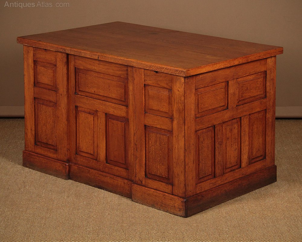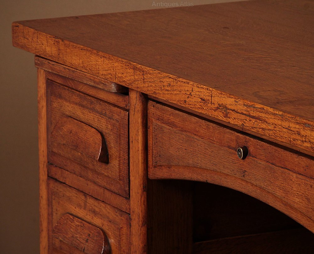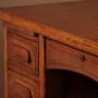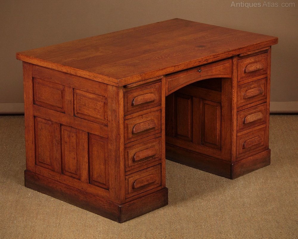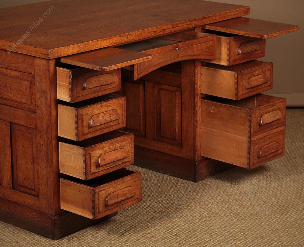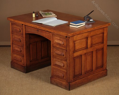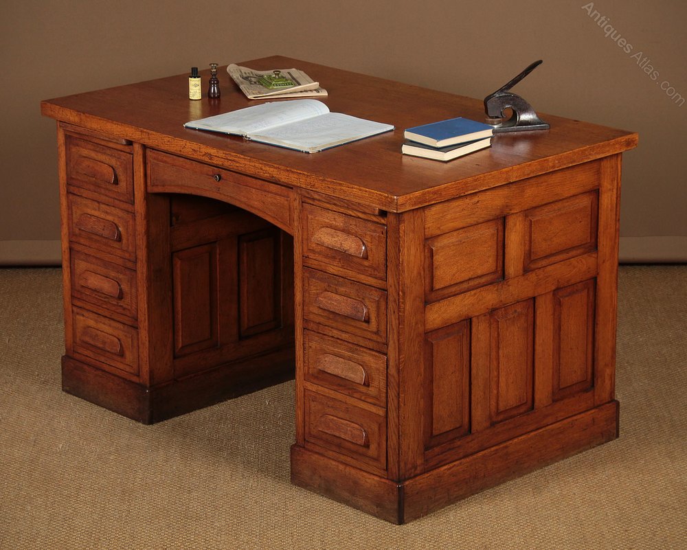 Superb Edwardian oak pedestal desk c.1910. 50″ x 32″ top (1½” thick) raised in on 4-drawer pedestals with moulded handles and a double height drawer to the base of the right hand pedestal. With an extra drawer above the kneehole. A good quality desk with solid oak fielded panels to the sides and rear, polished on all sides. Excellent condition, cleaned and waxed in our workshops. Disassembles for ease of delivery.