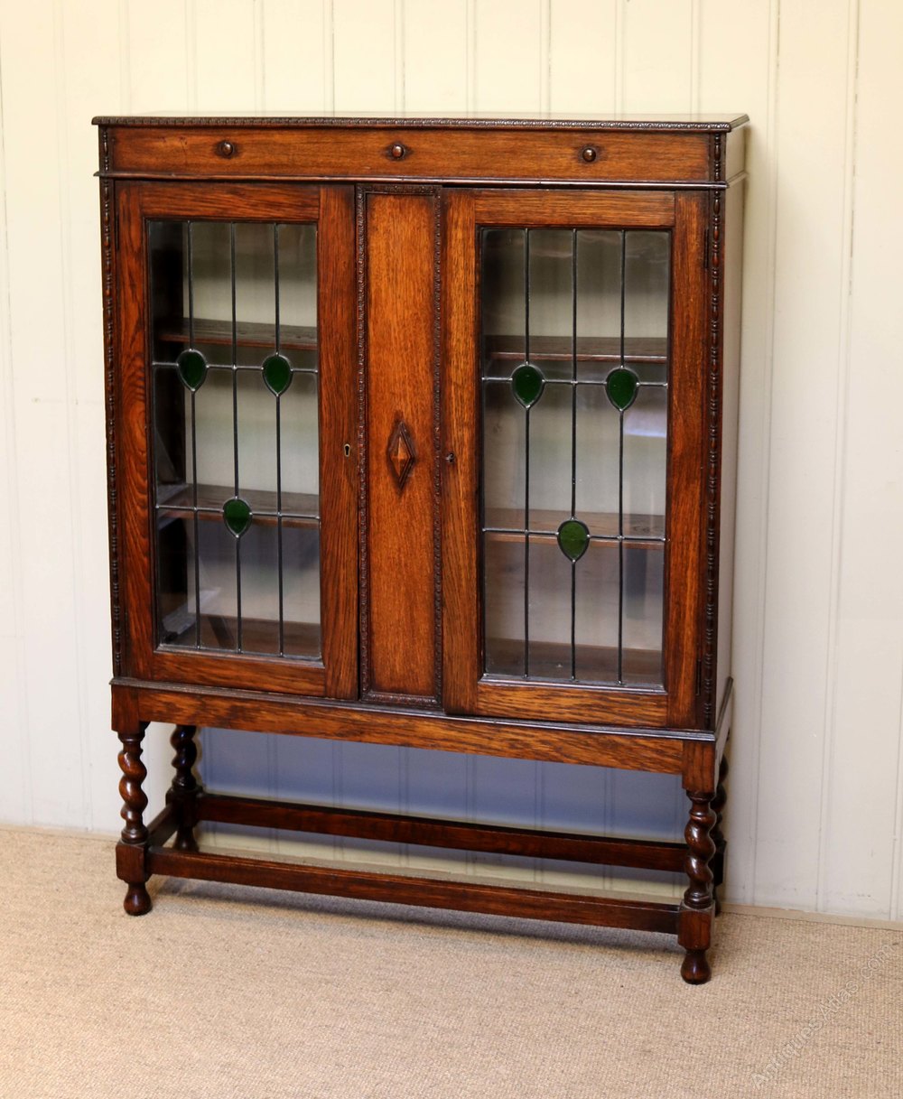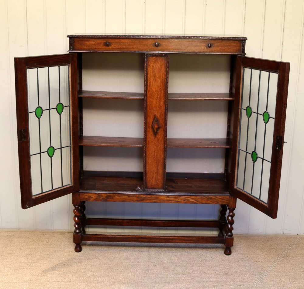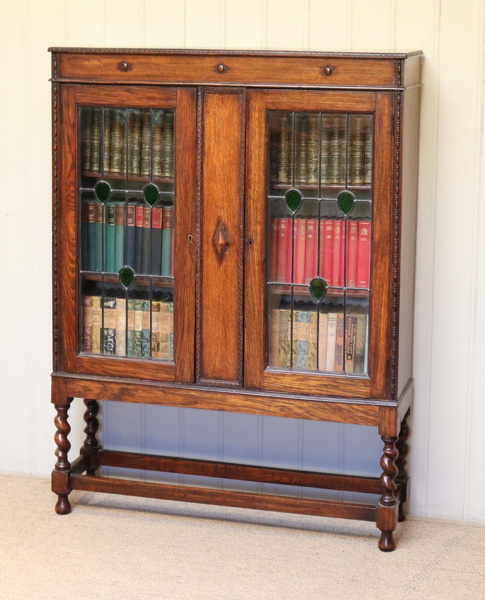 Oak two door glazed bookcase having two internal fully adjustable shelves with lead light doors having stained glass decoration raised on barleytwist support united by an understretcher