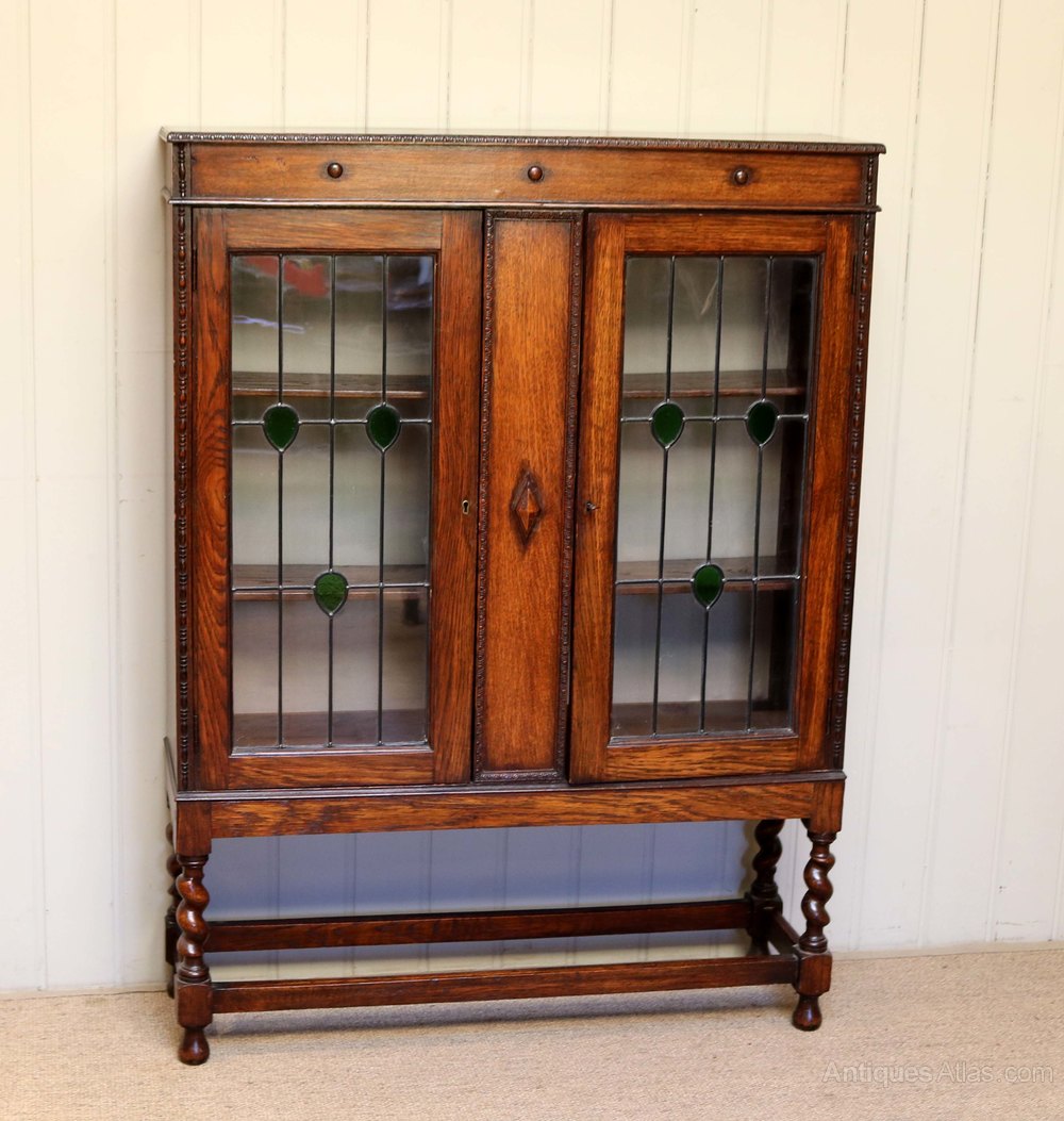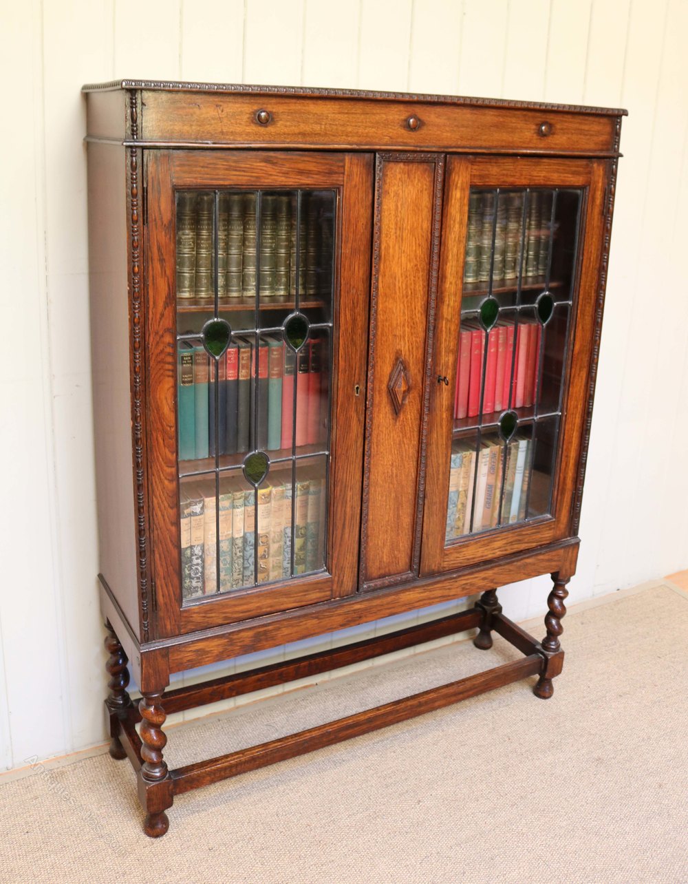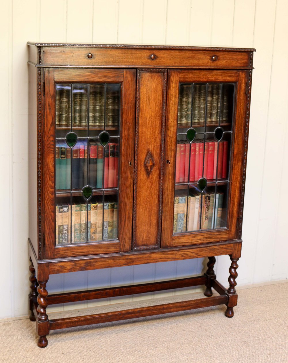 Oak two door glazed bookcase having two internal fully adjustable shelves with lead light doors having stained glass decoration raised on barleytwist support united by an understretcher