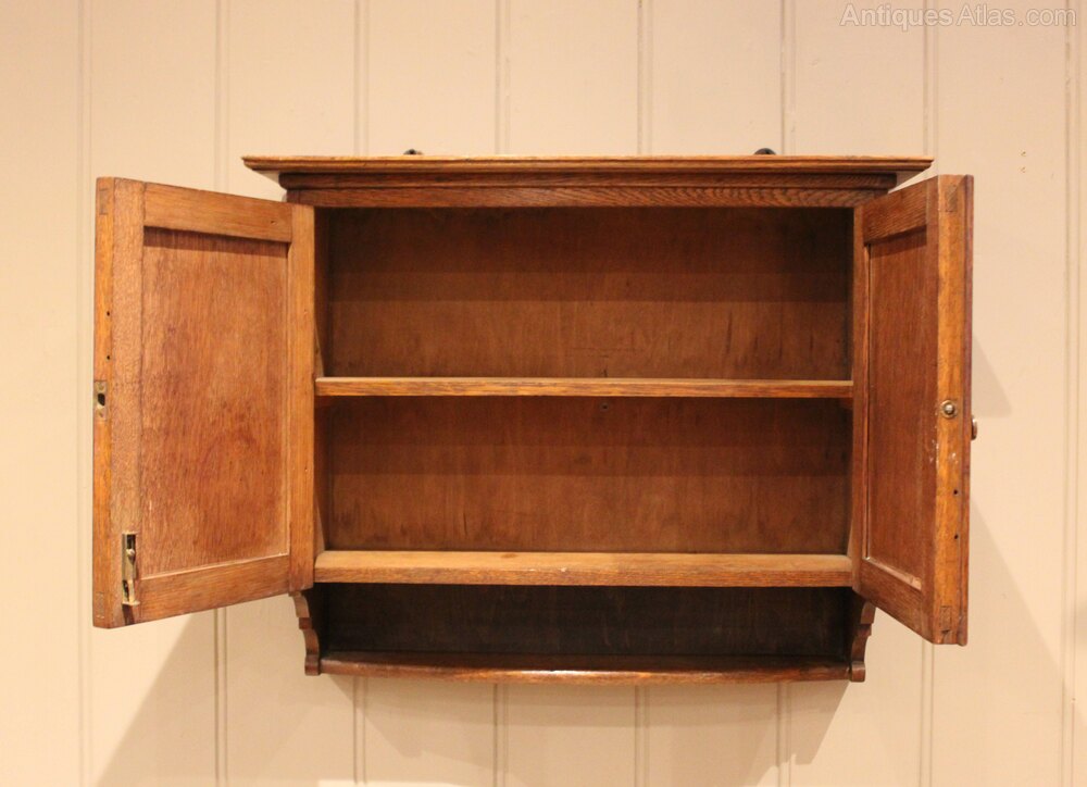 Edwardian oak wall cabinet having two doors opening to reveal a shelved interior with a small shelf to the base .