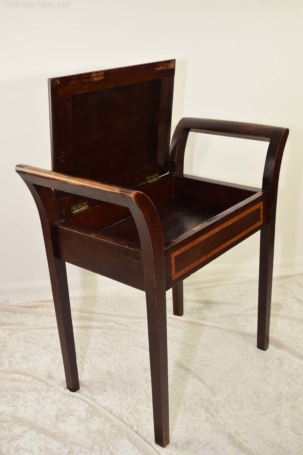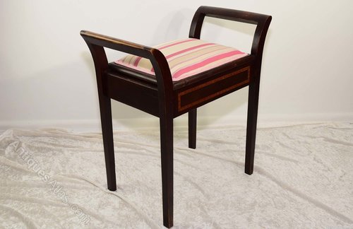 This is a stylish Edwardian mahogany piano stool with lovely boxwood and satinwood inlay to the front. The seat lifts to reveal a storage compartment underneath. The stool's side rails show the years of use that adds to the patina and character. Perfect as a piano stool or dressing table stool.