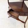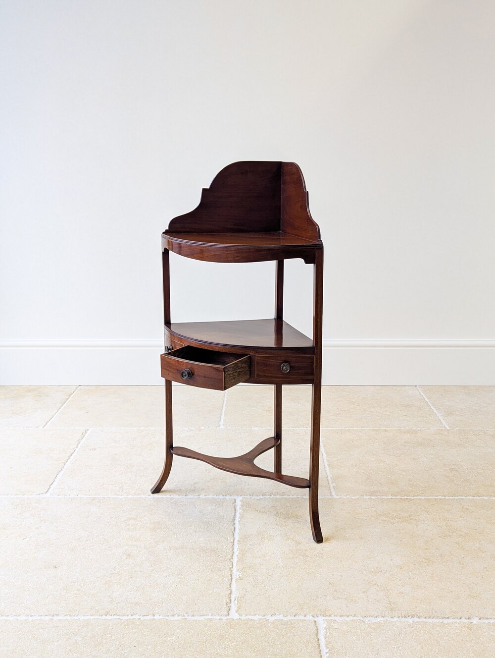 An Edwardian Sheraton Revival corner table crafted in mahogany with a light, elegant frame and two tiers, the lower fitted with a single working drawer flanked by two false fronts, all with original die-stamped brass knobs.