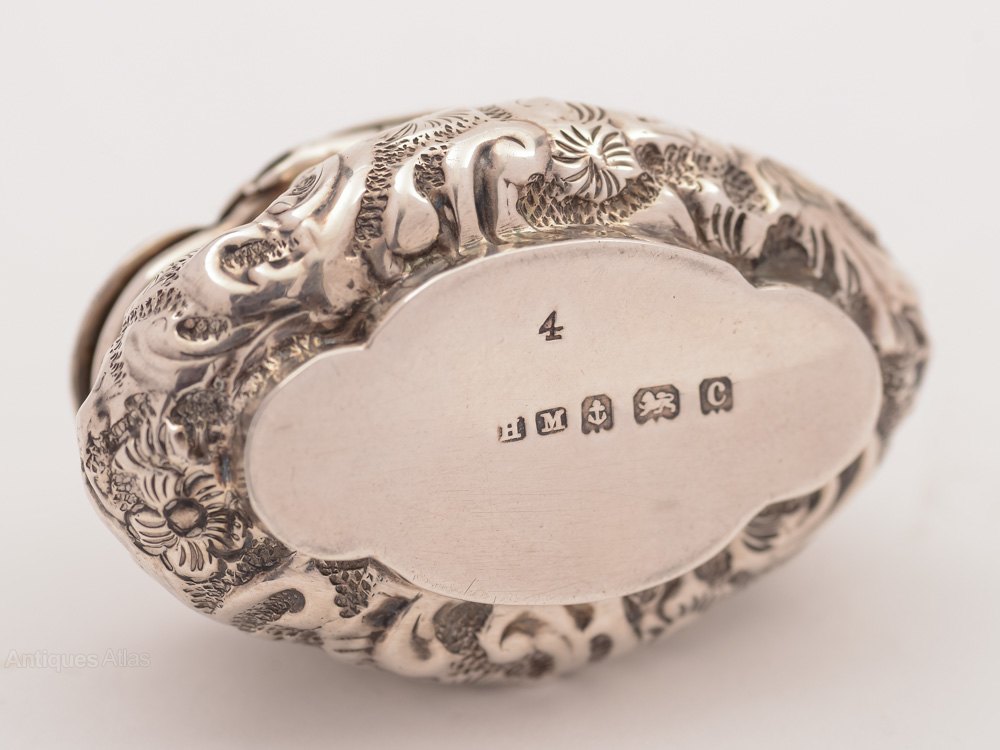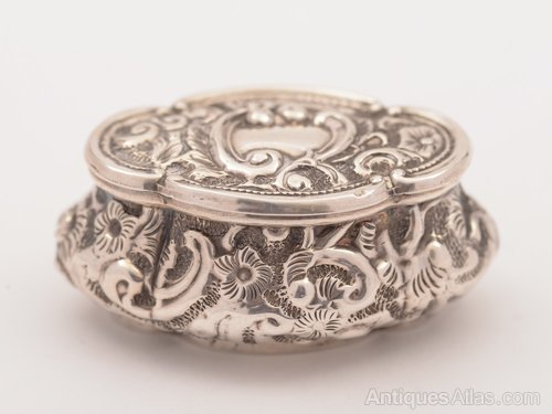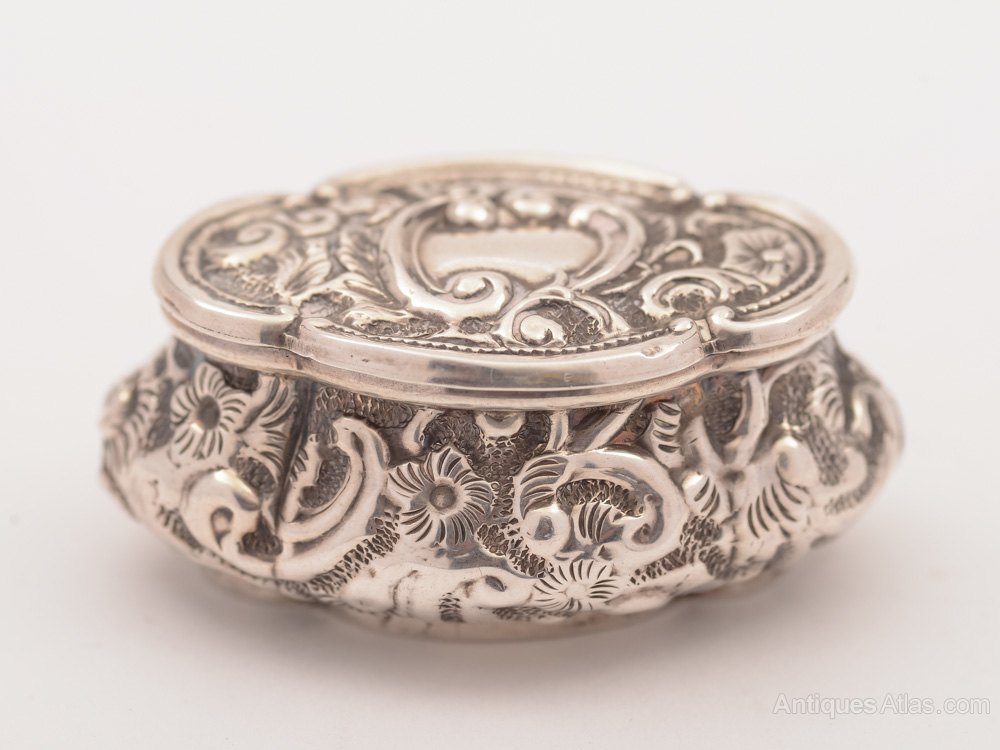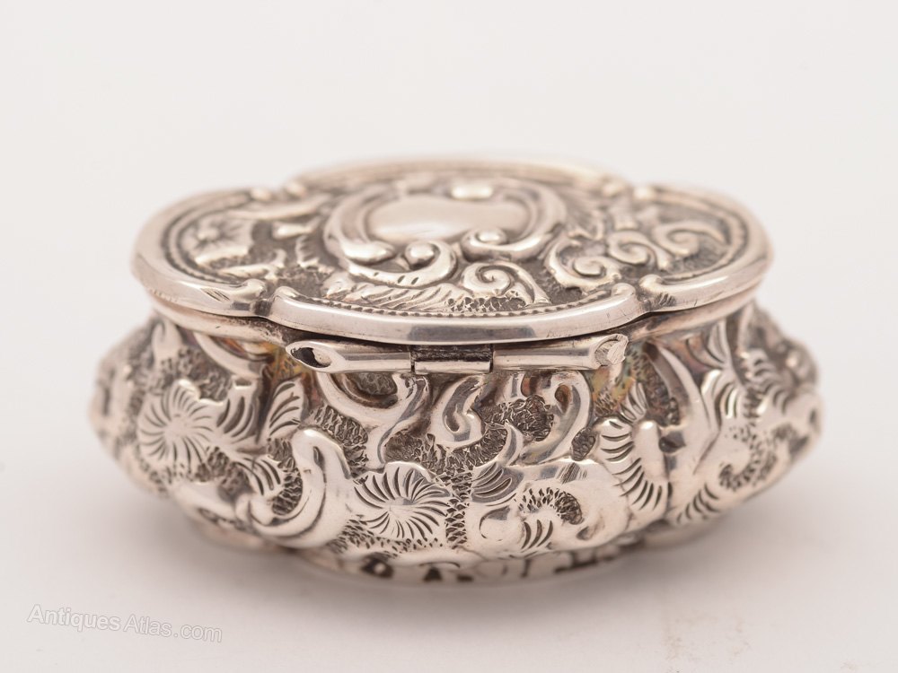 A lovely English Edwardian silver pill box with embossed decoration, vacant cartouche to hinged lid and original gilded interior. Hallmarked Birmingham 1902 and marked 'H M' for maker Henry Matthews, Birmingham.