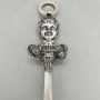 The rattle was made in Birmingham by silversmiths Crisford & Norris and dates to 1906. Harold Crisford & William Norris established their business in 1896 at premises in Vyse Street in Birmingham’s Jewellery Quarter. They are best known for their good quality and well designed small items for personal use, novelty baby rattles, pin cushions and stylish powder compacts. They remained in business up until around 1970.