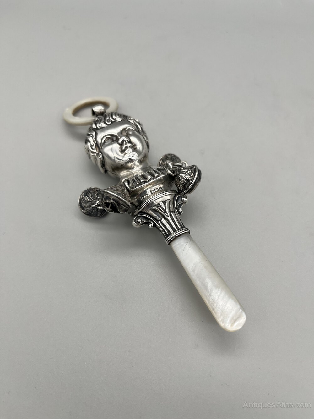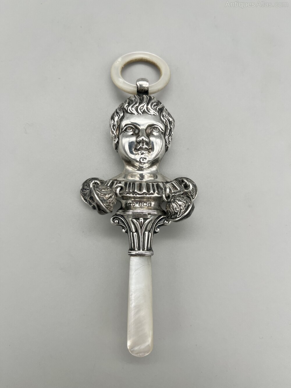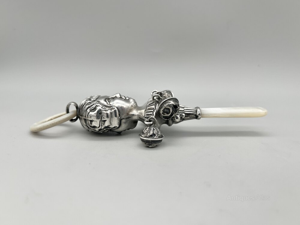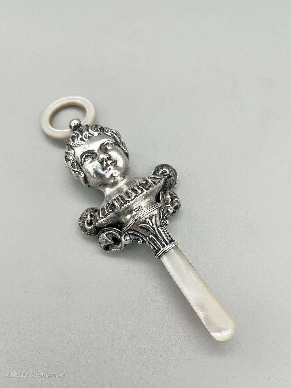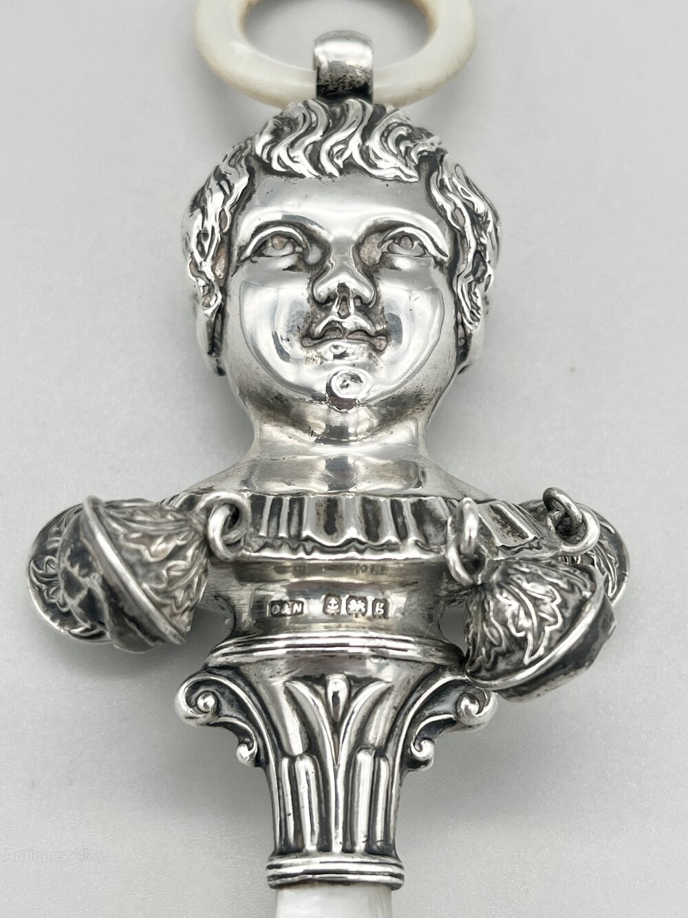 Here we have a charming Edwardian Sterling Silver and Mother of Pearl Baby's Rattle and Teething Ring. The silver rattle is beautifully modelled as a child's head and shoulders sitting on top of a Corinthian column from which hang four leaf decorated rattle bells. The handle and teething ring are both made of mother of pearl.