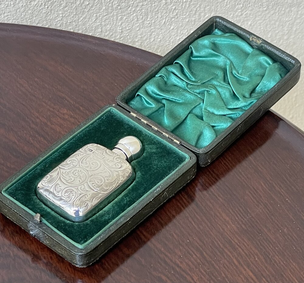 An absolutely stunning Edwardian solid silver scent bottle in fitted case, hallmarked Chester 1902 by G Watts & Co (George Watts). A delightful piece, with sharp floral engraved decoration and central cartouche.