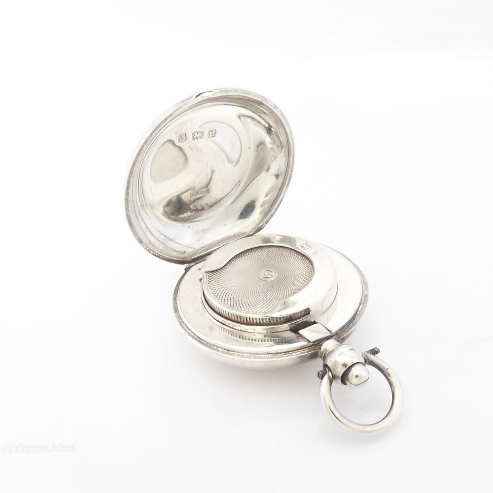 Very clear and crisp hallmarks are visible on the inside of the lid for the Birmingham Assay office with a date mark for 1902 and Lion Passant indicating fine sterling silver and maker's mark for Aaron Lufkin Dennison. Partial marks also visible on the spring loaded frame.