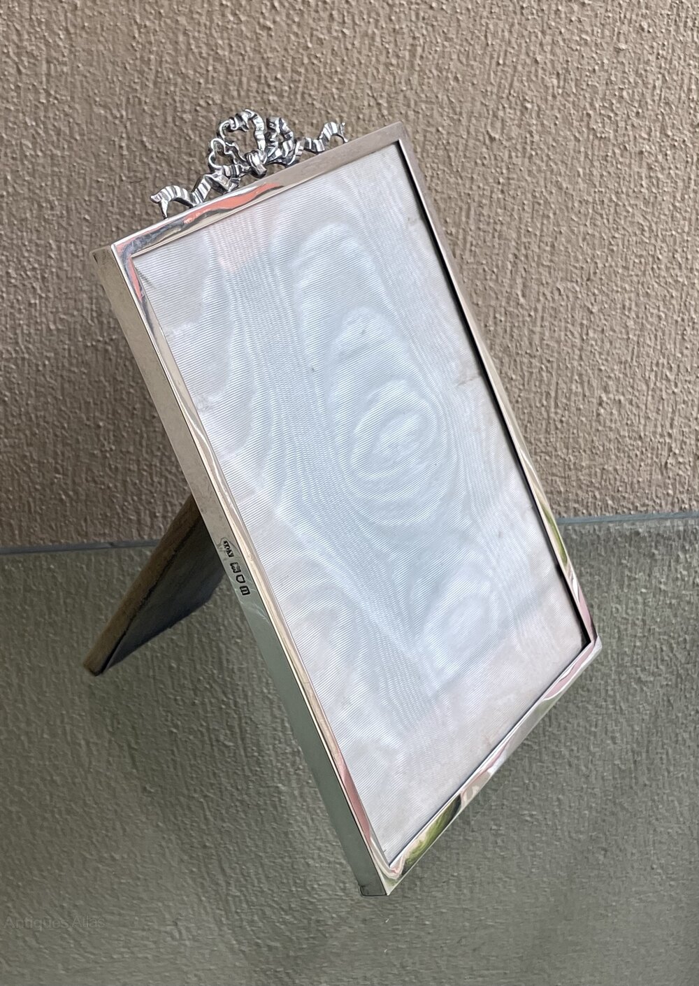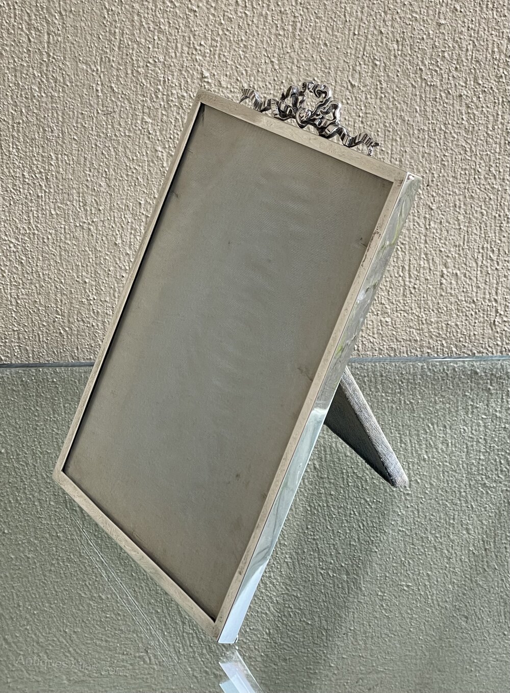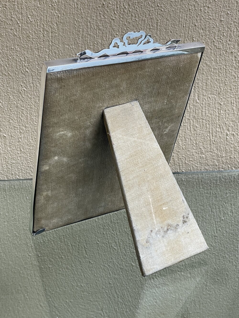 The frame is topped with a stunning Ribbon and Bow mount and retains the original back and folding easel stand. The glass with very small hairline crack to one corner. We can replace this if needed for £15.