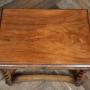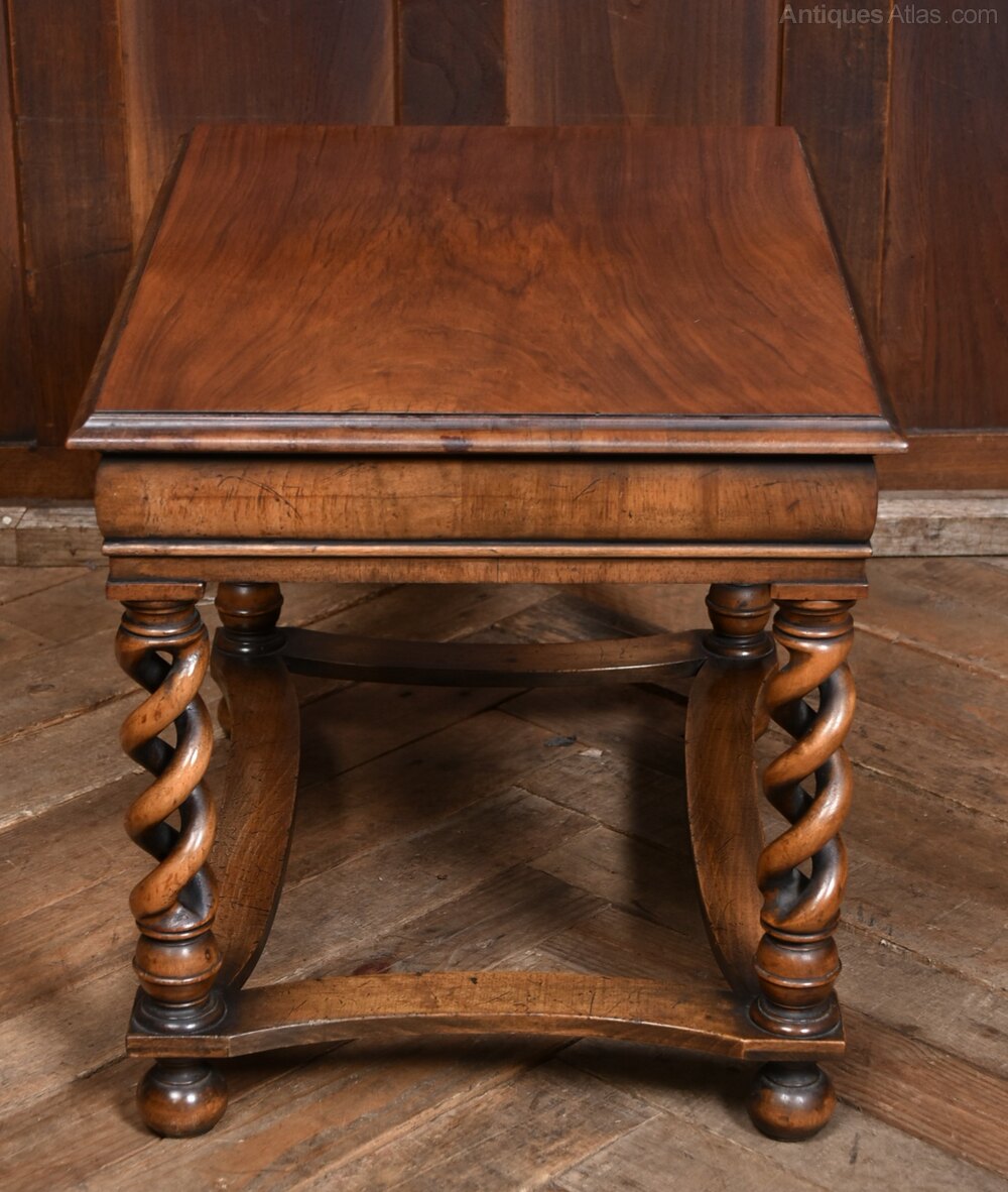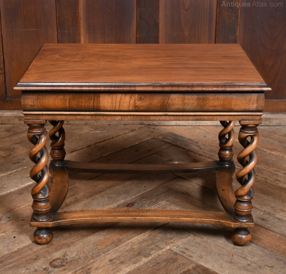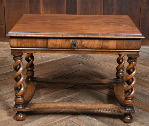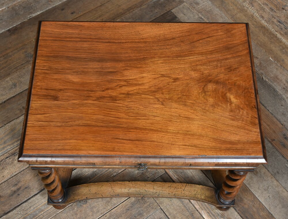 Superb Edwardian side table, crafted from solid walnut, in excellent antique condition. Made by Tibbenham of Ipswich, it features a rectangular top with a thumb nail edge resting on a cushion frieze. A single drawer, adorned with a decorative handle. The table stands on intricately carved open barley twist legs, which terminate in ball feet and are elegantly connected by concave stretchers. The rich walnut wood boasts a warm finish, beautifully showcasing the natural grain. Both practical and decorative, this table perfectly encapsulates the Edwardian era’s hallmark attention to detail and exceptional craftsmanship.