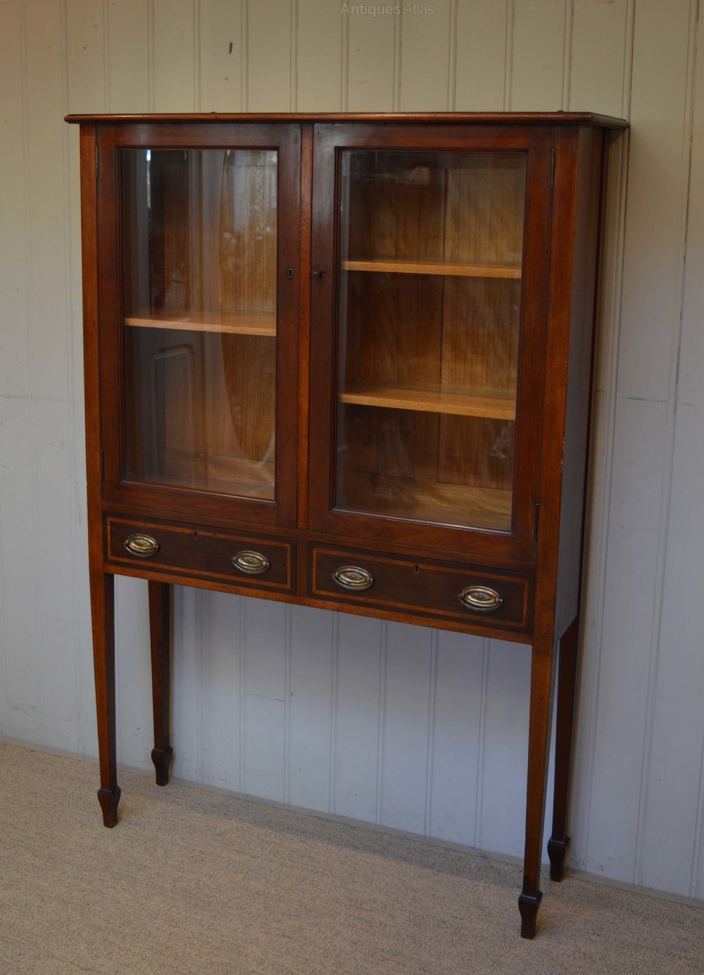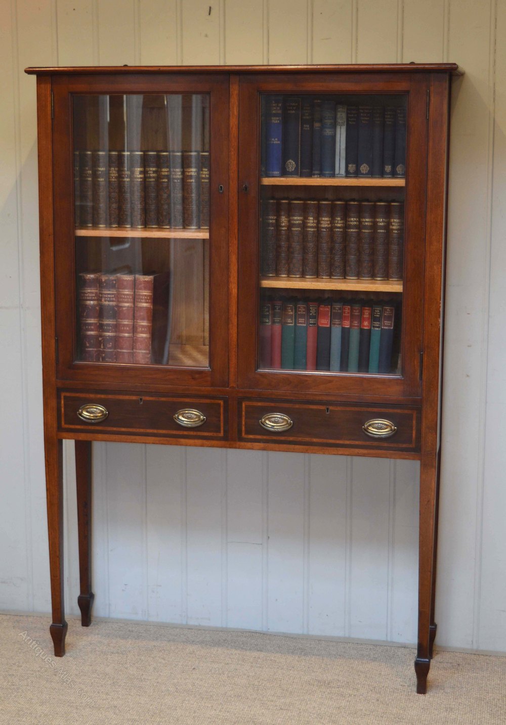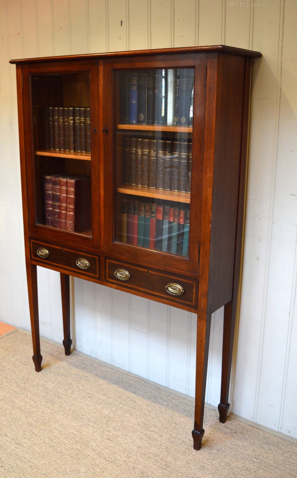 Edwardian slim bookcase having two glazed doors above a pair of base drawers raised on tapering legs with spade feet