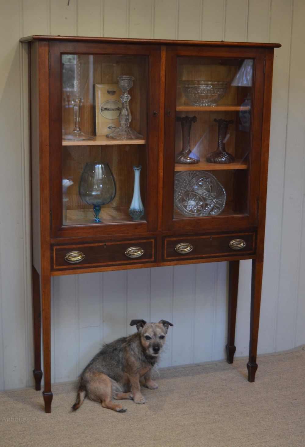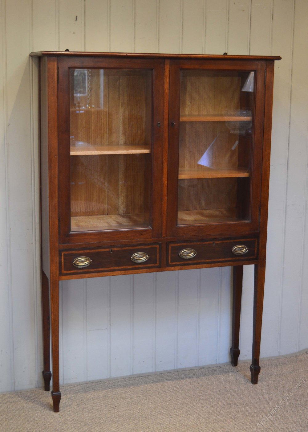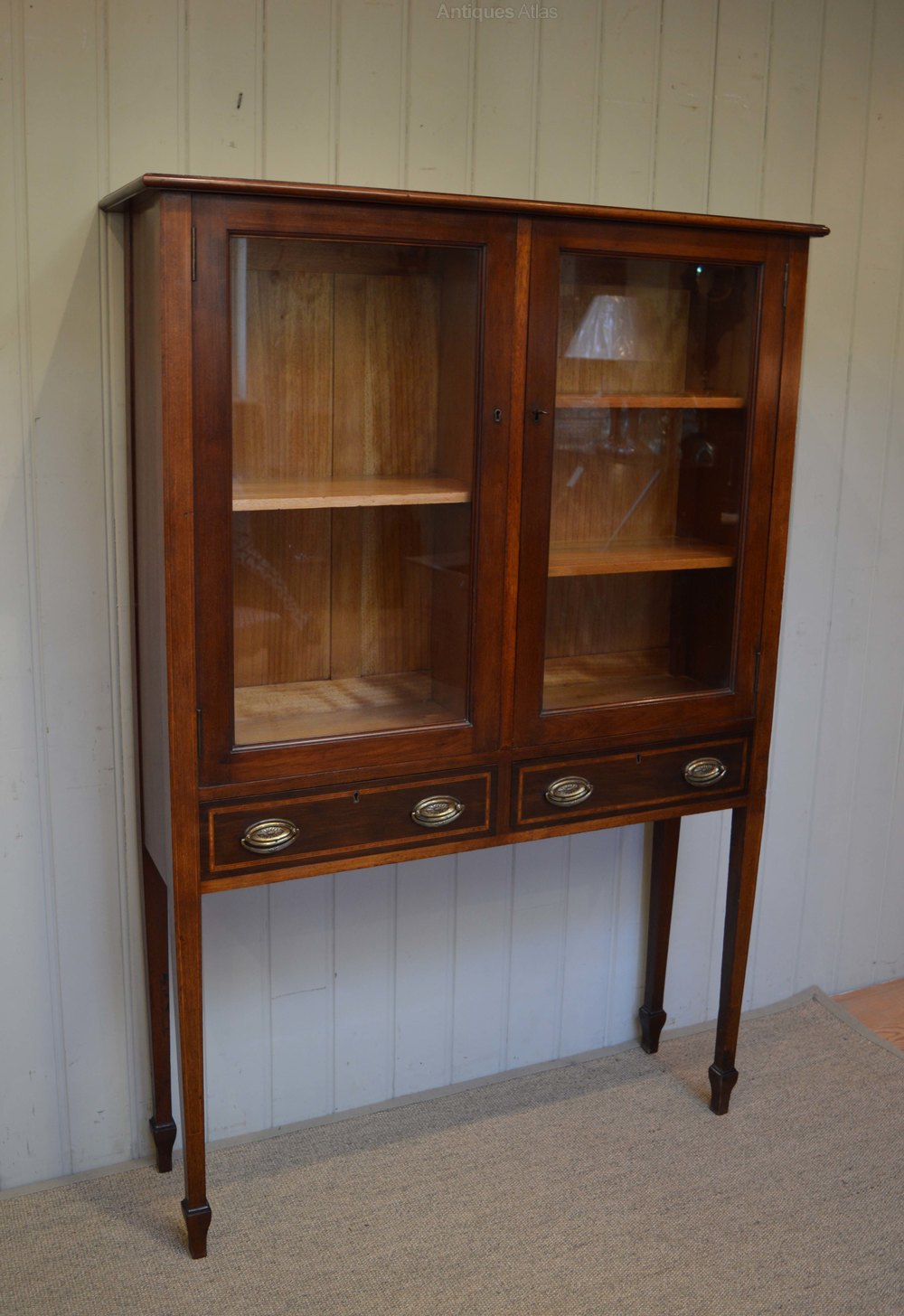 Edwardian slim bookcase having two glazed doors above a pair of base drawers raised on tapering legs with spade feet