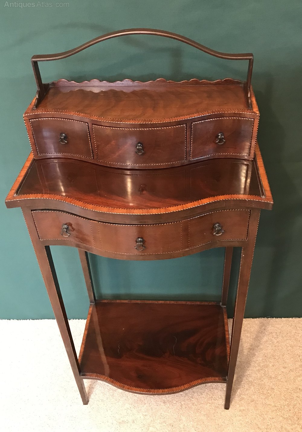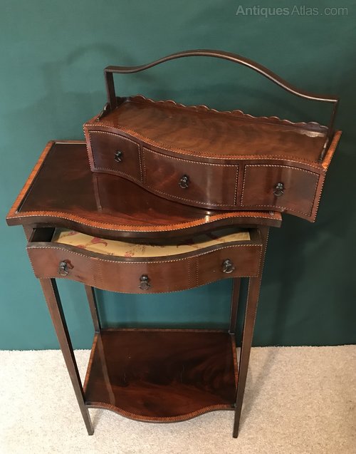 An interesting two-part Edwardian side table. The lift-off top of serpentine outline, fitted with an arrangement of three drawers, over a projecting top, fitted with a further drawer. The tapered supports, joined by a conforming stretcher. This table is in fantastic condition. Ht 94, W 44, D 29 cms.