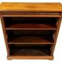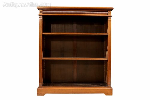 The bookcase is flanked by fluted uprights and fitted with two adjustable shelves above a fixed base shelf, offering practical and versatile storage for books or display objects. The walnut has mellowed to a warm, attractive tone, with a pleasing patina consistent with age and use.