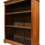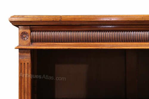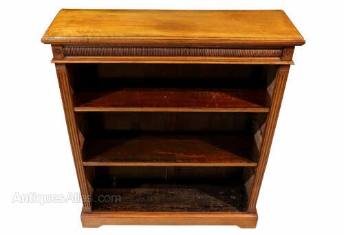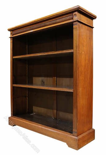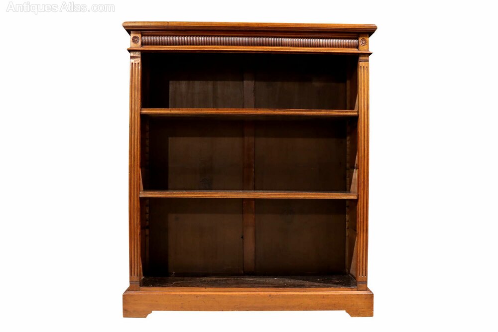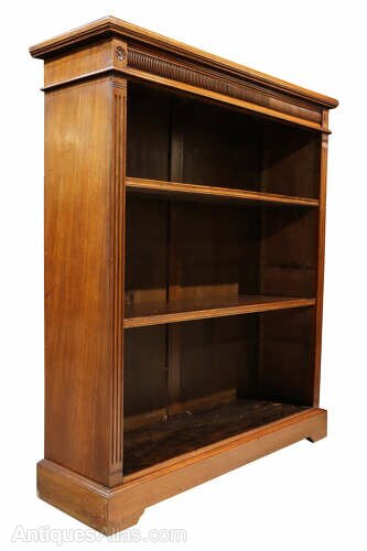 An elegant Edwardian walnut open bookcase dating from the early 20th century, displaying well-balanced proportions and refined classical detailing. The moulded cornice is enriched with a finely reeded frieze, punctuated at each corner by carved floral roundels, adding subtle decorative interest without overpowering the form.