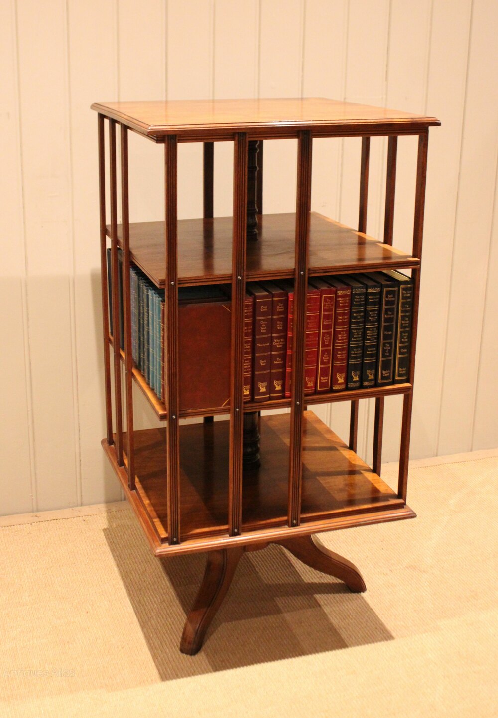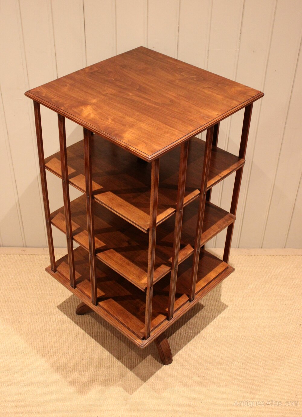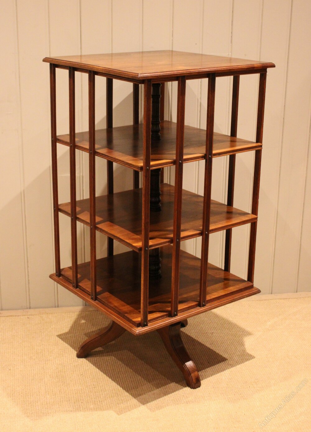 Edwardian walnut revolving bookcase having three tiers with full access from the open sides , having slatted sides to retain the books ,held together by a turned central column ,raised on a tripod base that revolves freely .