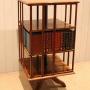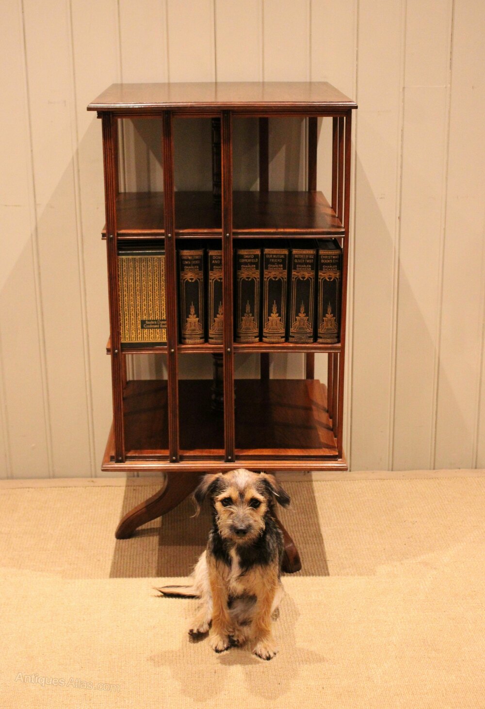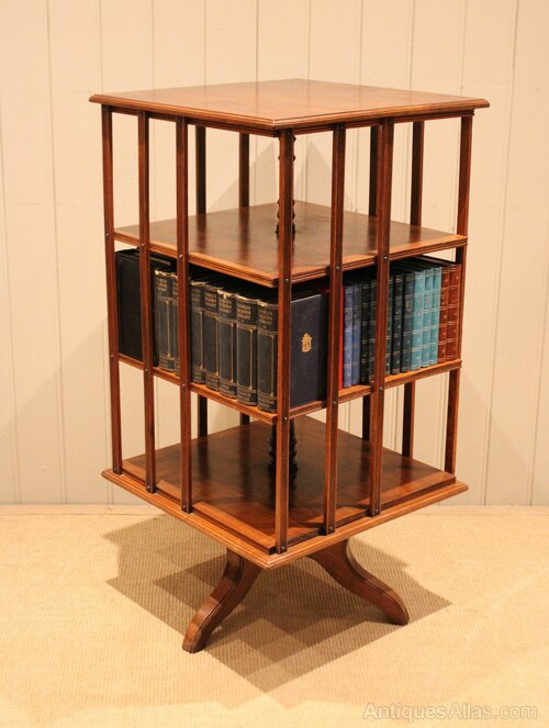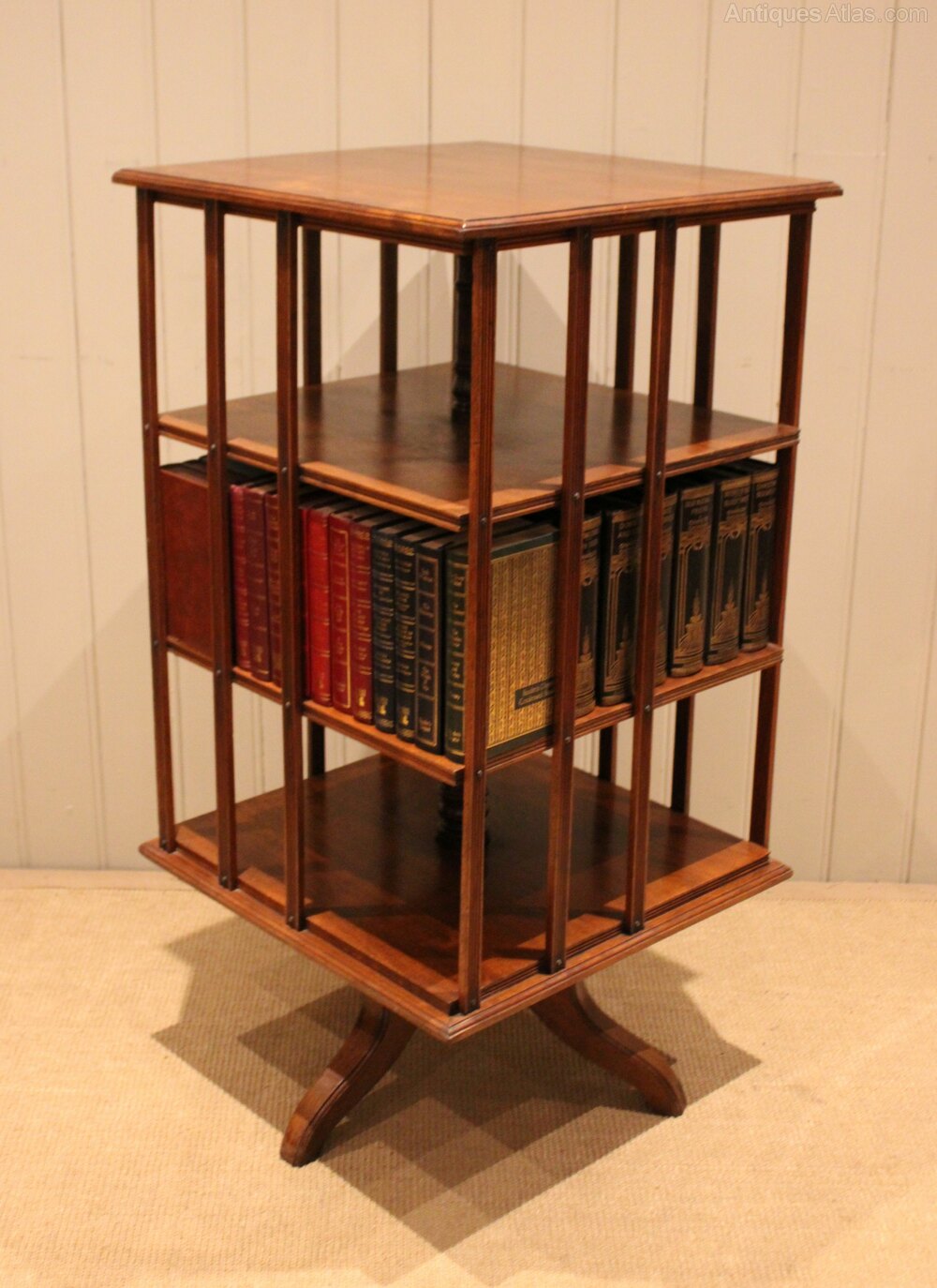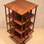 Edwardian walnut revolving bookcase having three tiers with full access from the open sides , having slatted sides to retain the books ,held together by a turned central column ,raised on a tripod base that revolves freely .