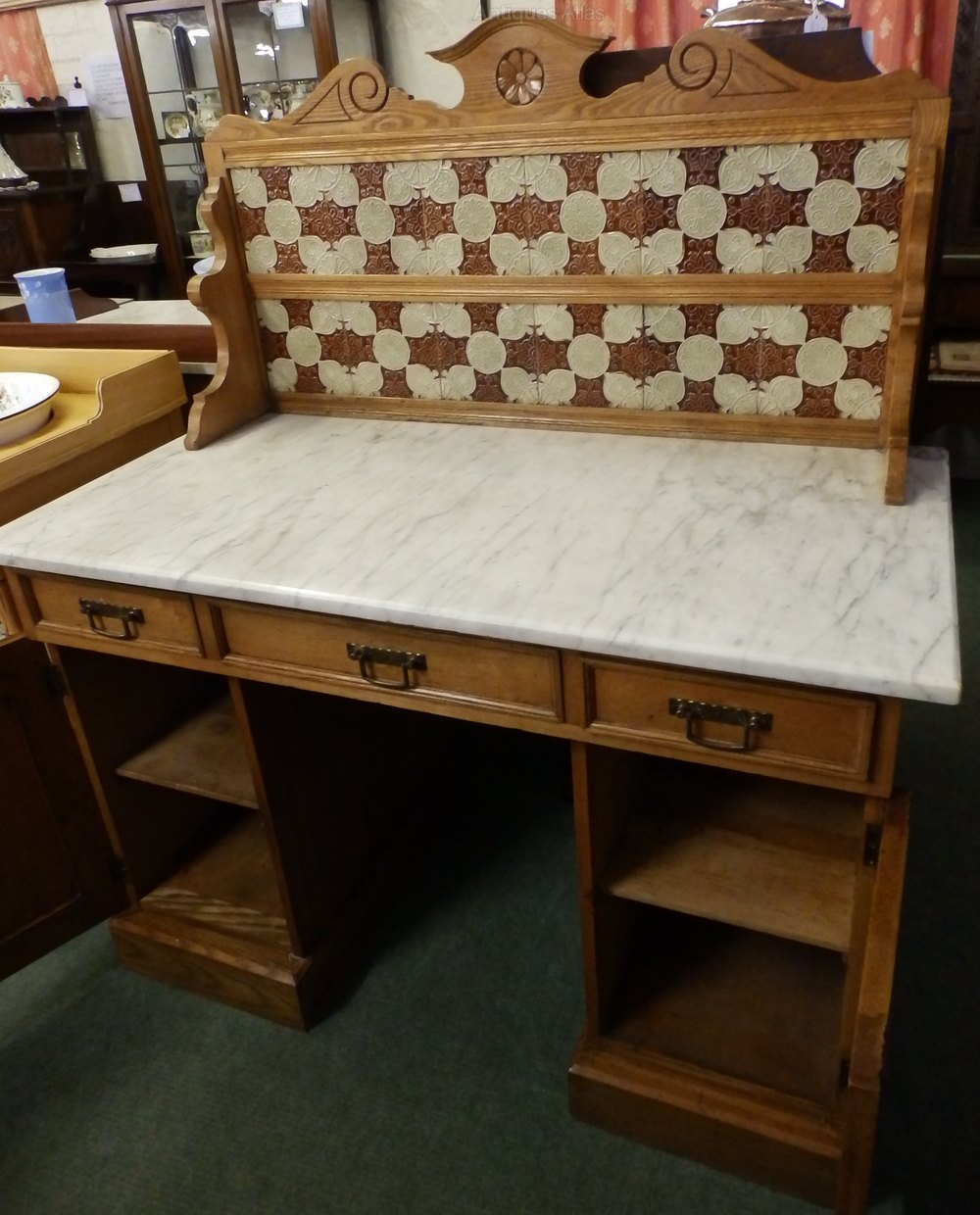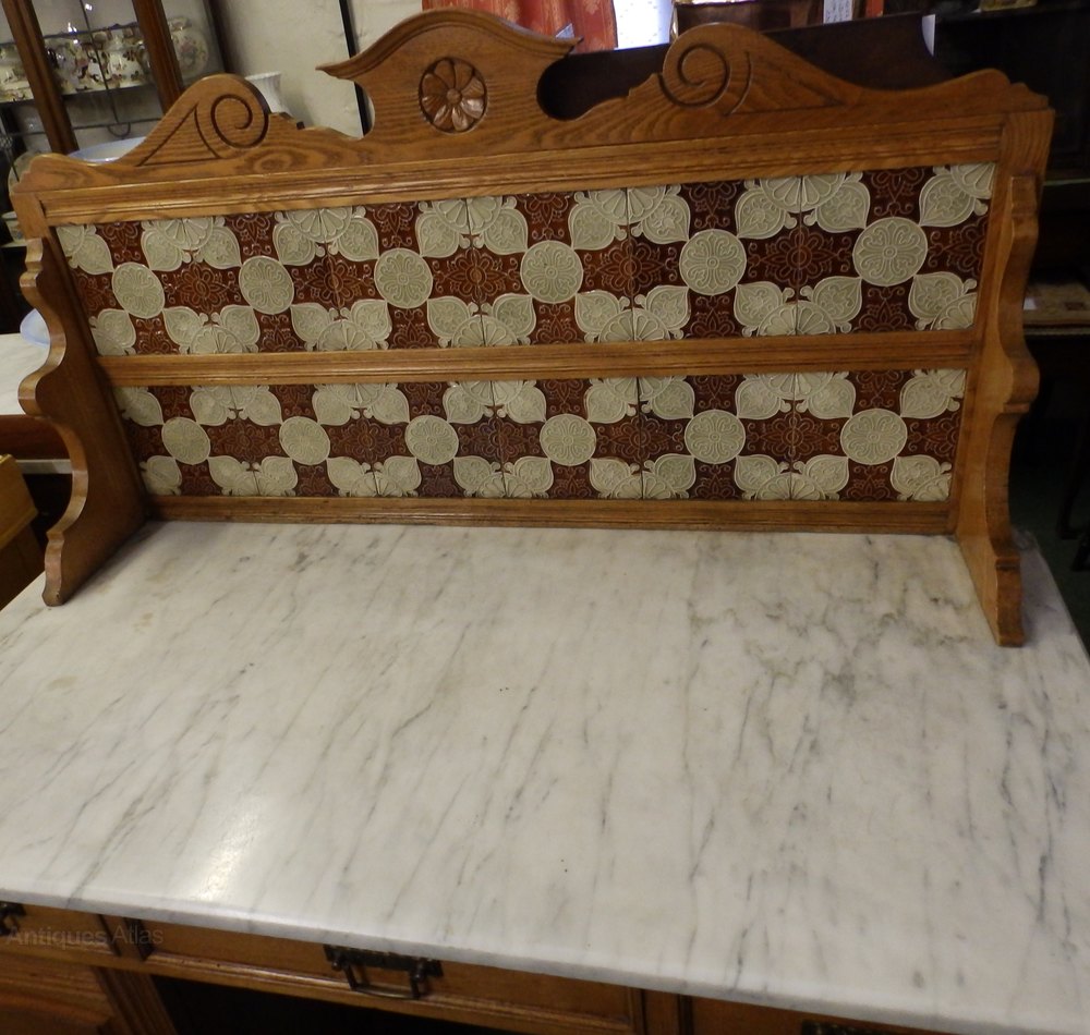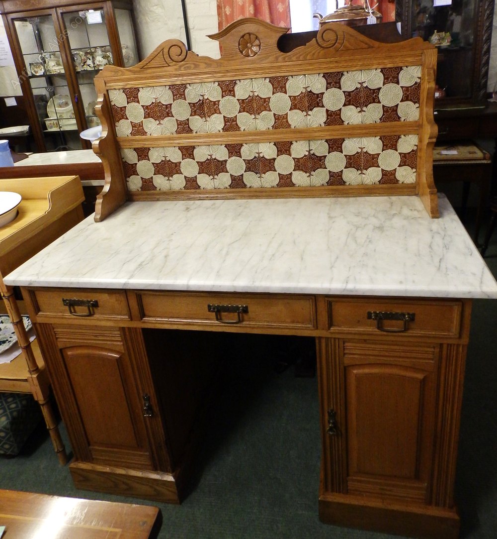 NO199-Edwardian oak marble top tiled back washstand tiles and marble in very good condition has had some woodworm in the front been well treated