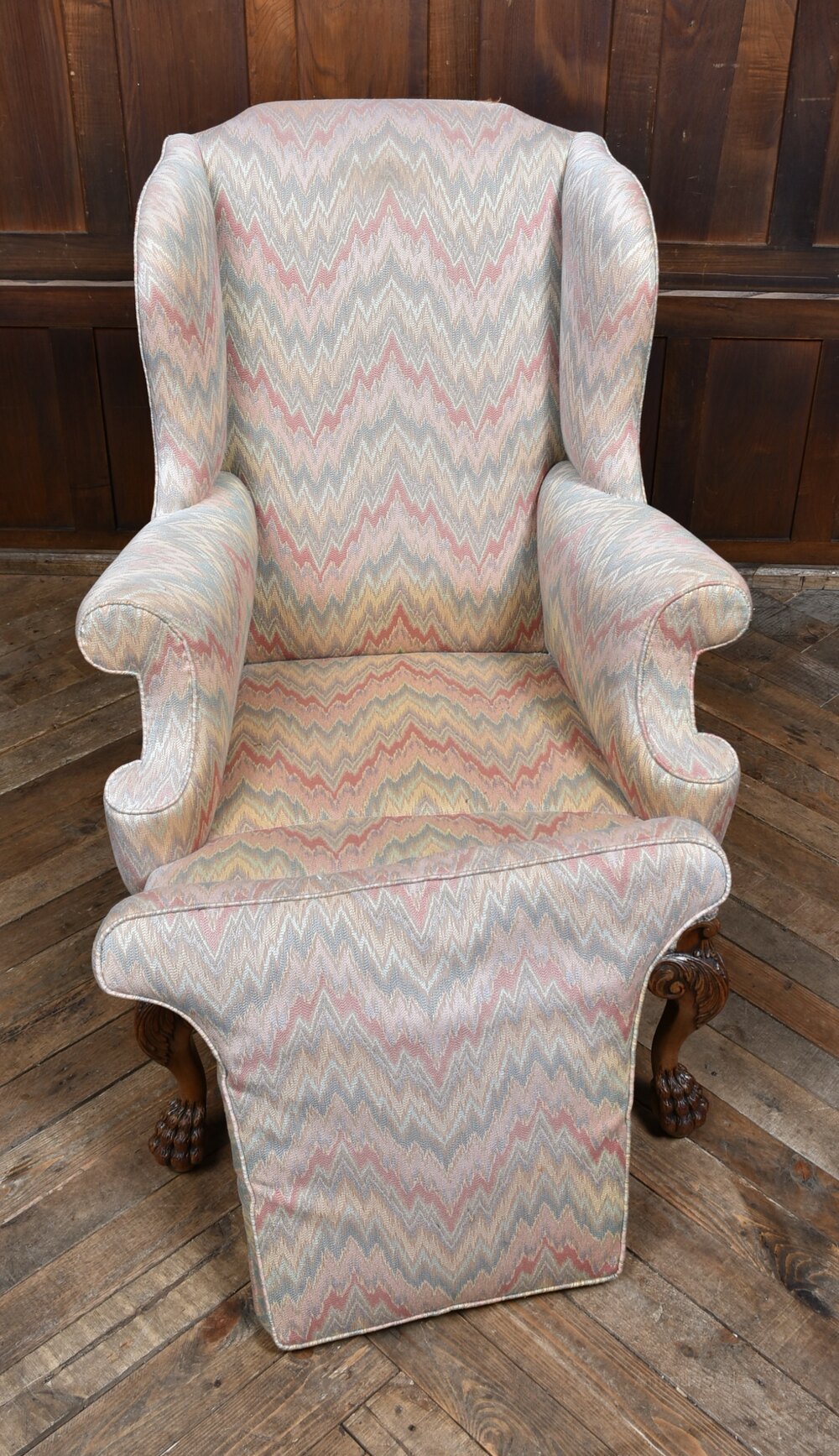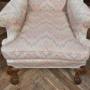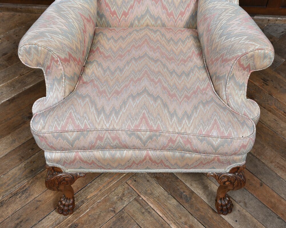 A charming Edwardian wing-back armchair upholstered in a soft, pastel zig-zag fabric. The chair features rolled arms, a high winged back, and a generously cushioned seat, offering excellent comfort and support. The frame is raised on finely carved cabriole legs terminating in bold claw-and-ball feet, demonstrating the craftsmanship typical of the period. The upholstery is neatly finished and sits well against the warm tones of the timber. Elegant, comfortable, and full of character, this is a lovely Edwardian armchair that would sit beautifully in a reading nook, bedroom corner, or living space.
