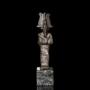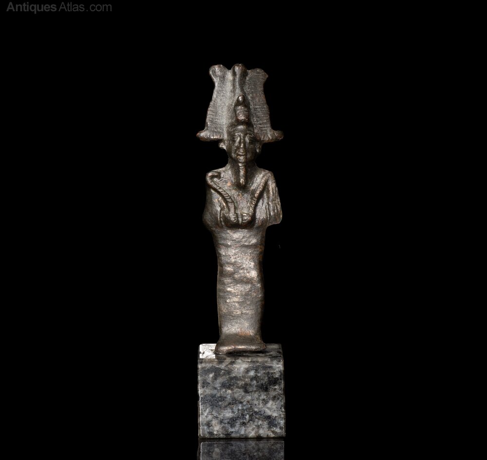 A relatively small but fine quality bronze figurine of the god Osiris in typical mummiform pose. He wears the divine and atef crown fronted by an uraeus serpent. In his hands he holds the customary implements, the crook and flail. At the base, a small tang for fixing. Fitted to a custom-made stone display stand.
