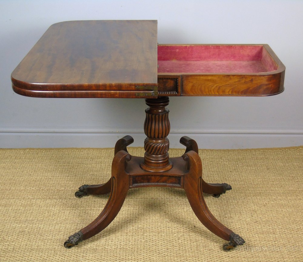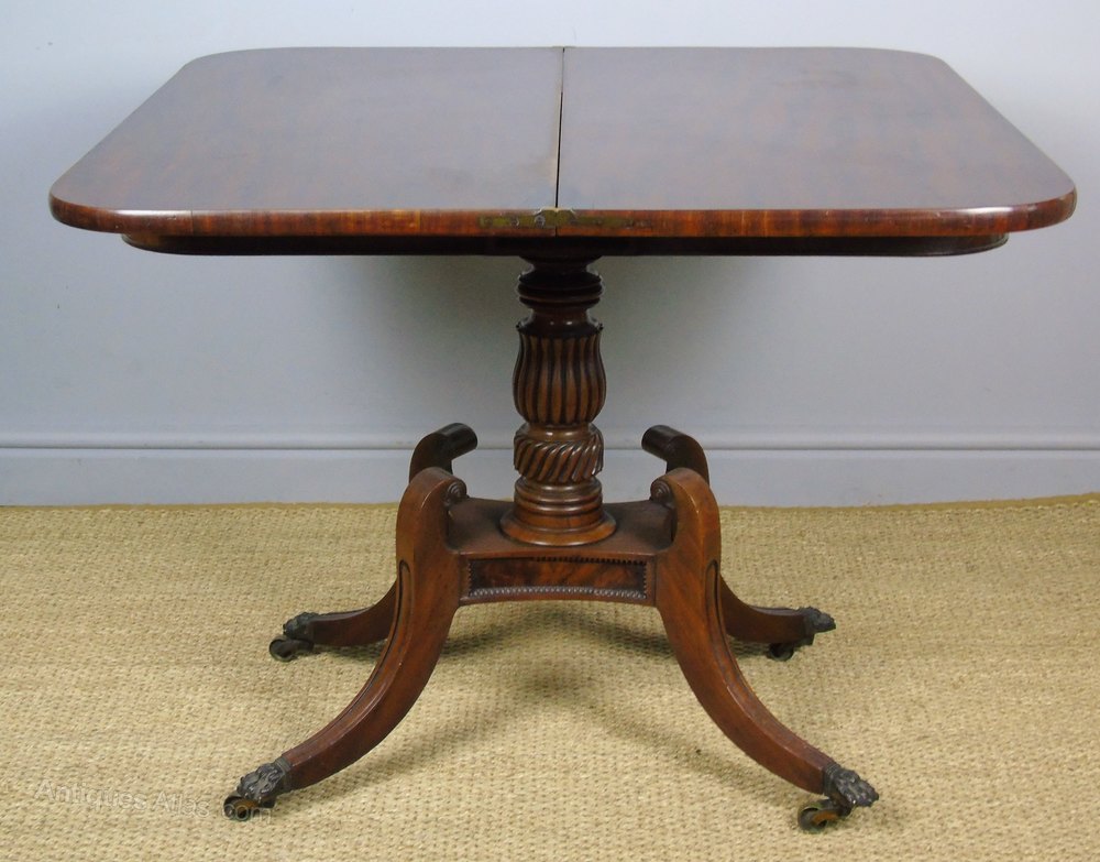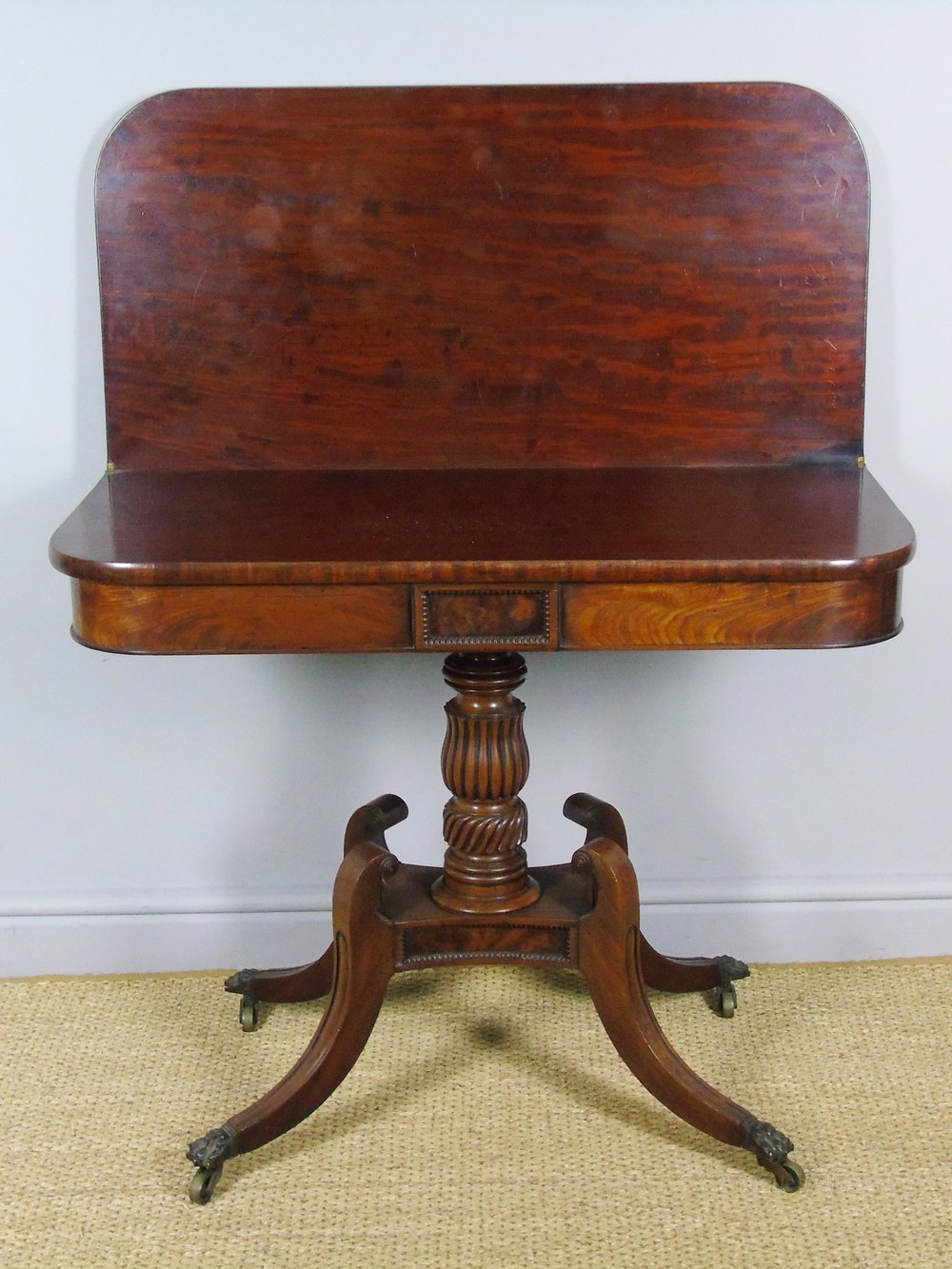 This is a good quality Regency period mahogany side table with turnover top action in super condition dating from around 1820. The table has beaded flame mahogany panels above and below the central reeded solid mahogany column. The classic design of the legs, with out swept curves and solid brass hairy paw cap castor feet elevate the table elegantly. The table has a good colour and patina and is in great condition ready for use.