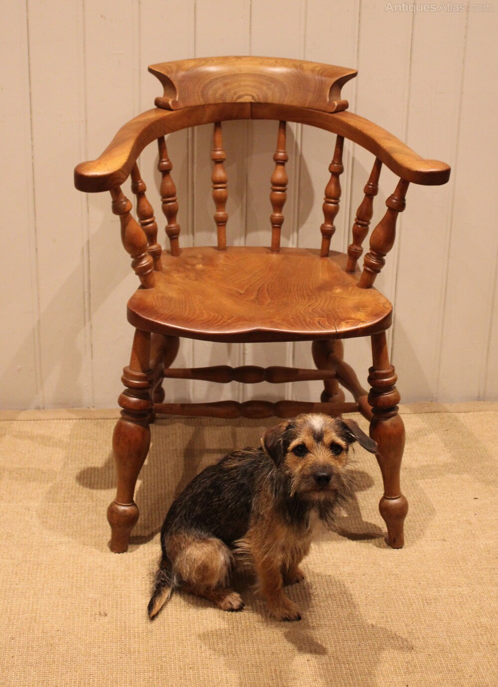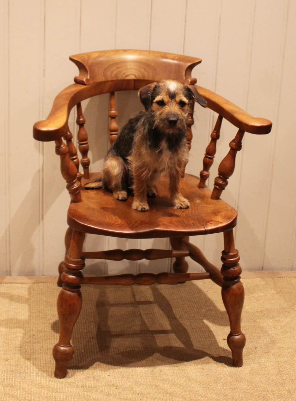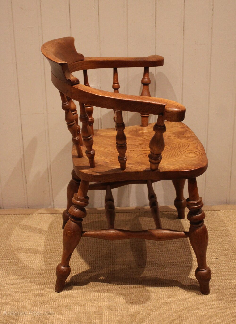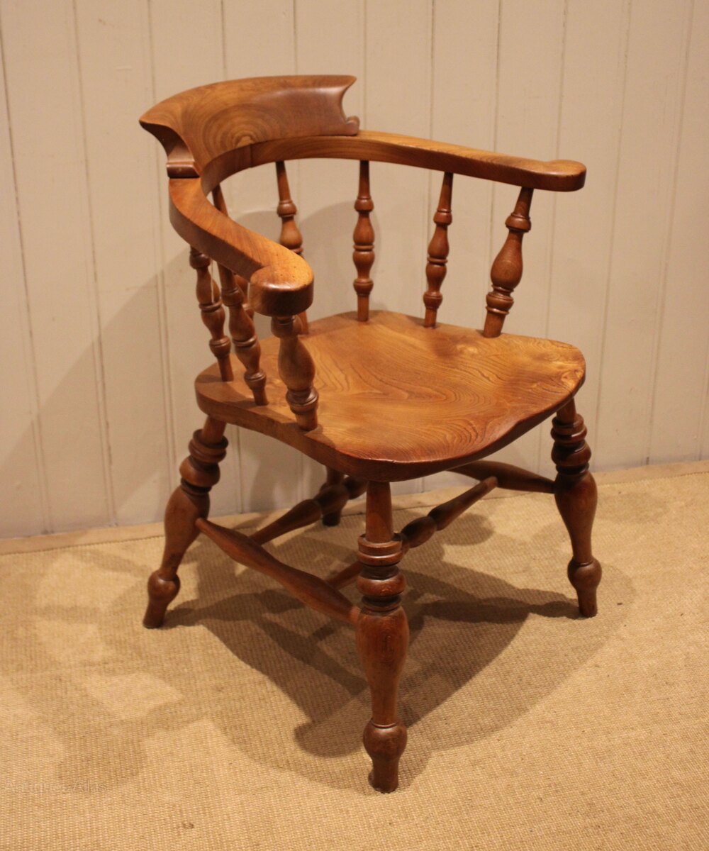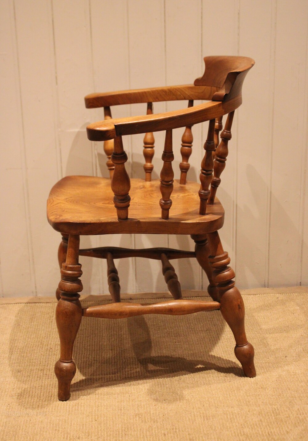 19th century smokers bow chair having out splayed arms and an elm seat and turned beechwood supports and underframe. The height to the seat is 45 cm