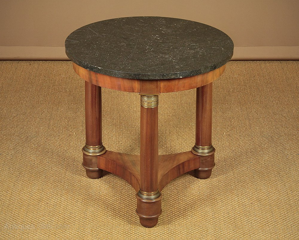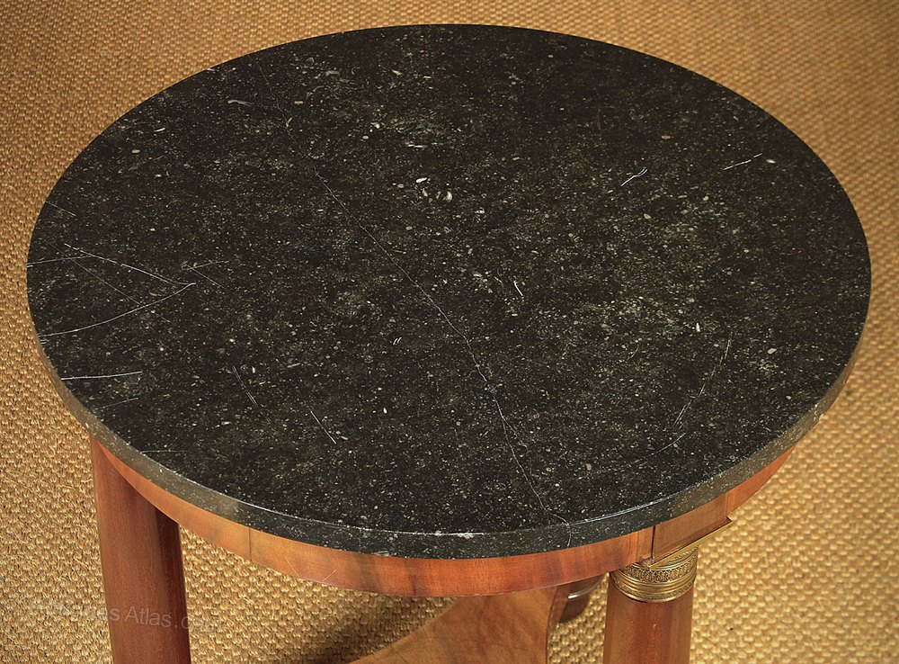 Smart little French Empire style marble top gueridon side table c.1930. Circular black marble top over a mahogany veneered apron raised on three turned mahogany column legs with good quality tooled brass mounts to the capitals and bases. On a shaped tricorn plinth and turned bun feet. Some obvious scratches to the marble, otherwise excellent condition, cleaned and polished in our workshops.