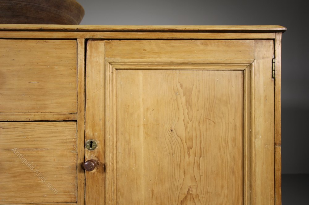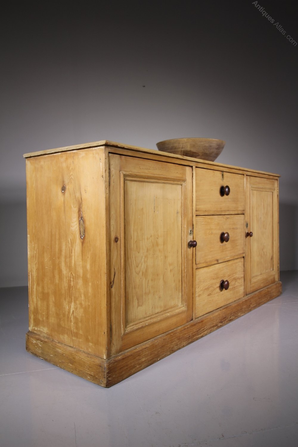 This early 19th century antique pine dresser base features three central drawers, all have the original fruitwood handles and are clean inside. Flanking the drawers are a pair of panelled cupboards, inside is a large, clean storage area with a single fixed pine shelf in each. Perfect to use in a free-standing kitchen, all in very good original condition and the pine has a natural, scrubbed finish. English and dating from around 1830.