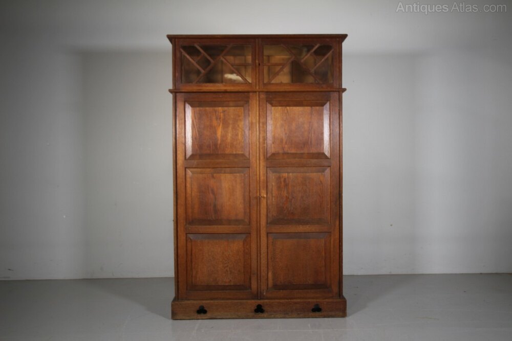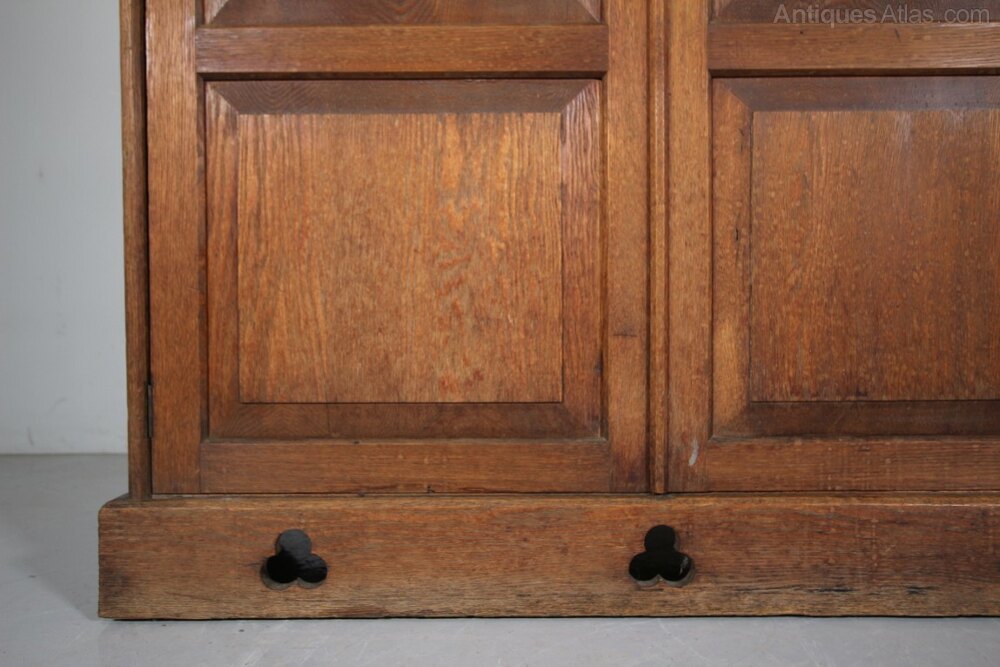 This is a wonderful, very good quality, English mid 19th century solid oak antique storage cupboard of large proportions. In excellent, clean condition and still the original lovely colour. An interesting design, having Anglo Japanese Aesthetic style glazed doors to the top with a pair of long doors beneath, these have raised and chamfered panels. Inside has pine removable shelves which are original, most probably a one off design, made for a specific house, on the inside of the doors is an old paper label with an inventory of items to be stored within the cupboard such as, tea clothes, nursery clothes and chamber clothes. This lovely English antique cupboard stands on a square plinth that has pierced clover leaf motifs to all three sides. Complete with a working lock and key and in superb condition throughout. Dates to 1850.